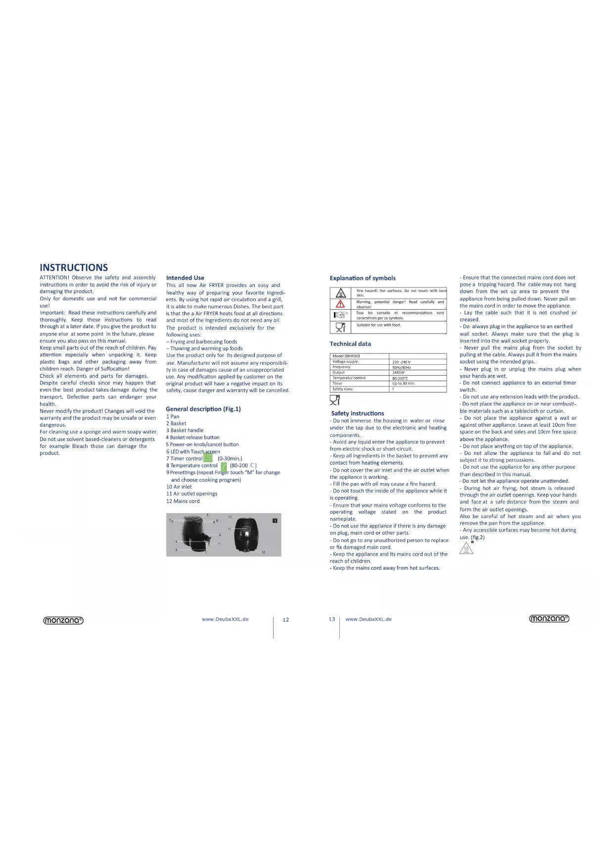 ble materials such as a tablecloth or curtain. - Do not place the appliance against a wall or against other appliance. Leave at least 10cm free space on the back and sides and 10cm free space above the appliance. - Do not place anything on top of the appliance. - Do not allow the appliance to fall and do not subject it to strong percussions. - Do not use the appliance for any other purpose than described in this manual. - During hot air frying, hot steam is released through the air outlet openings. Keep your hands and face at a safe distance from the steam and form the air outlet openings. Also be careful of hot steam and air when you remove the pan from the appliance. - Any accessible surfaces may become hot during use. (fig.2) Technical data - Do not immerse the housing in water or rinse components. - Avoid any liquid enter the appliance to prevent from electric shock or short-circuit. - Keep all ingredients in the basket to prevent any - Do not cover the air inlet and the air outlet when the appliance is working. - Fill the pan with oil may cause a fire hazard. - Do not touch the inside of the appliance while it - Ensure that your mains voltage conforms to the nameplate. - Do not use the appliance if there is any damage on plug, main cord or other parts. - Do not go to any unauthorized person to replace or fix damaged main cord. - Keep the appliance and its mains cord out of the reach of children. - Keep the mains cord away from hot surfaces. INSTRUCTIONS Fire hazard! Hot surfaces. Do not touch with bare skin.observe!caractérisés par ce symbole.Suitable for use with food.Model DBHF002220 -240 V50Hz/60HzVoltage supply:Frequency1485WOutput80-200°CTemperatur controlUp to 30 min.Timer Safety class:14