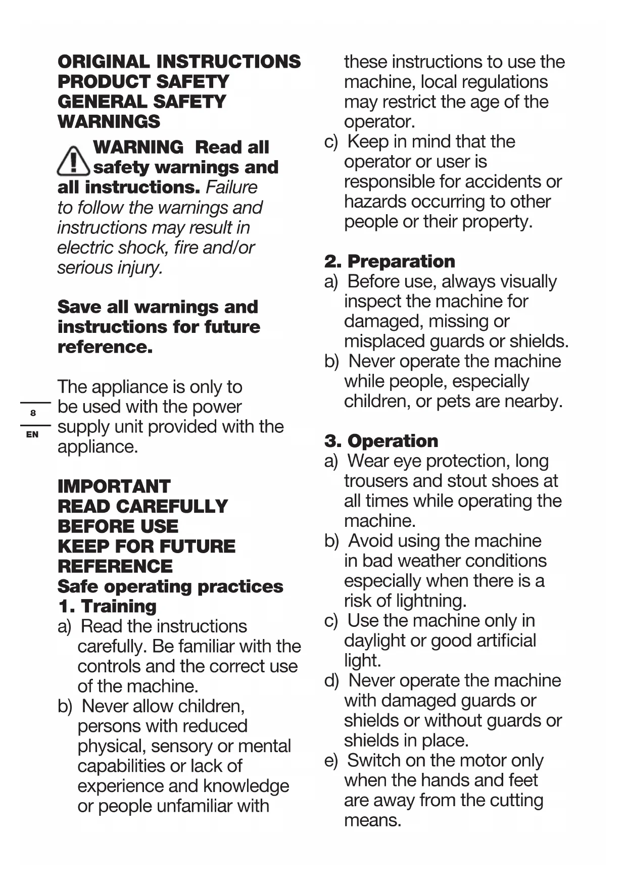 a) Read the instructions carefully. Be familiar with the controls and the correct use of the machine. b) Never allow children, persons with reduced physical, sensory or mental capabilities or lack of experience and knowledge or people unfamiliar with these instructions to use the machine, local regulations may restrict the age of the operator. c) Keep in mind that the operator or user is responsible for accidents or hazards occurring to other people or their property.