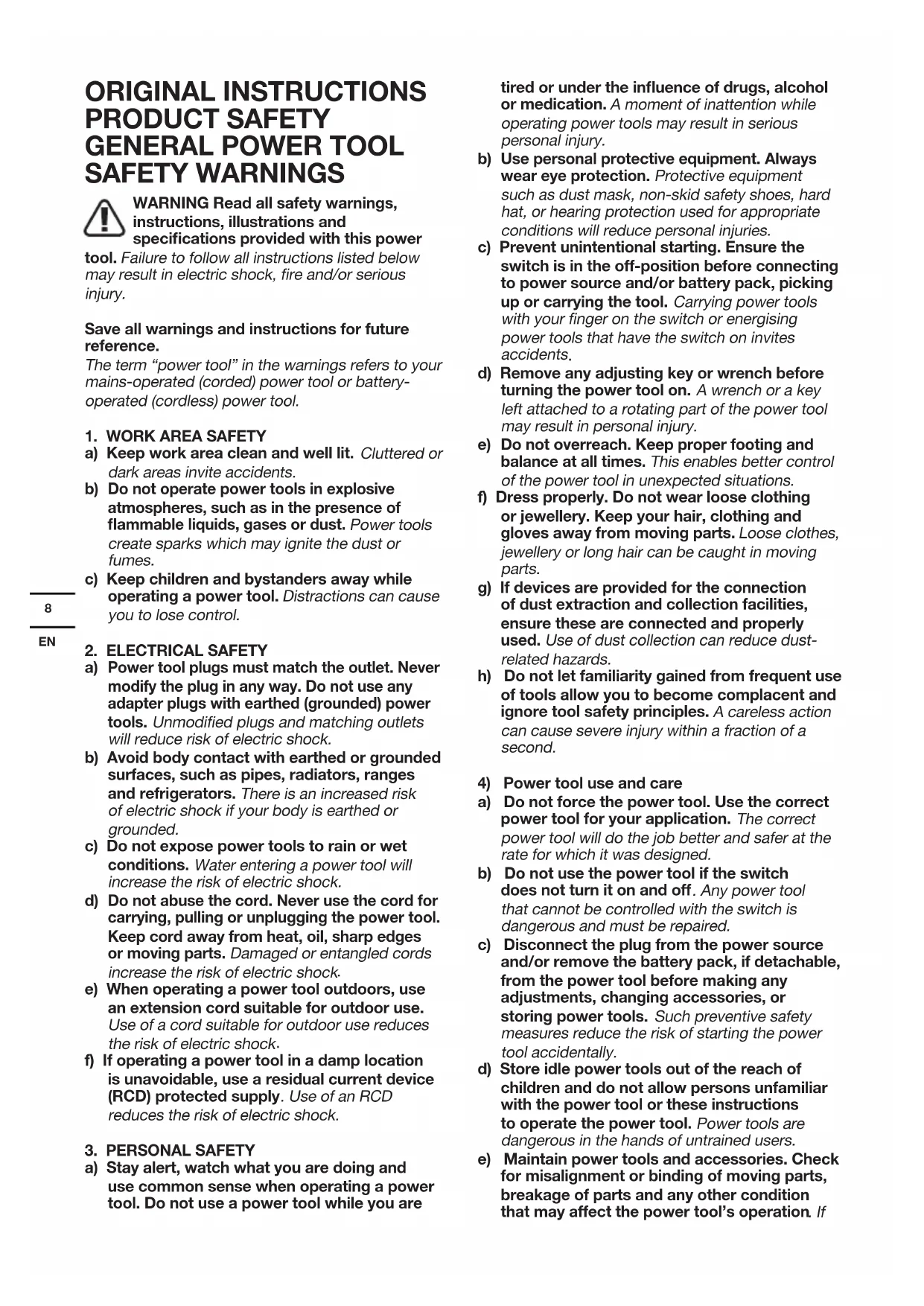 a) Do not force the power tool. Use the correct power tool for your application. The correct power tool will do the job better and safer at the rate for which it was designed. b) Do not use the power tool if the switch does not turn it on and off . Any power tool that cannot be controlled with the switch is dangerous and must be repaired. c) Disconnect the plug from the power source and/or remove the battery pack, if detachable, from the power tool before making any adjustments, changing accessories, or storing power tools. Such preventive safety measures reduce the risk of starting the power tool accidentally. d) Store idle power tools out of the reach of children and do not allow persons unfamiliar with the power tool or these instructions to operate the power tool. Power tools are dangerous in the hands of untrained users. e) Maintain power tools and accessories. Check for misalignment or binding of moving parts, breakage of parts and any other condition that may affect the power tool’s operation . If9