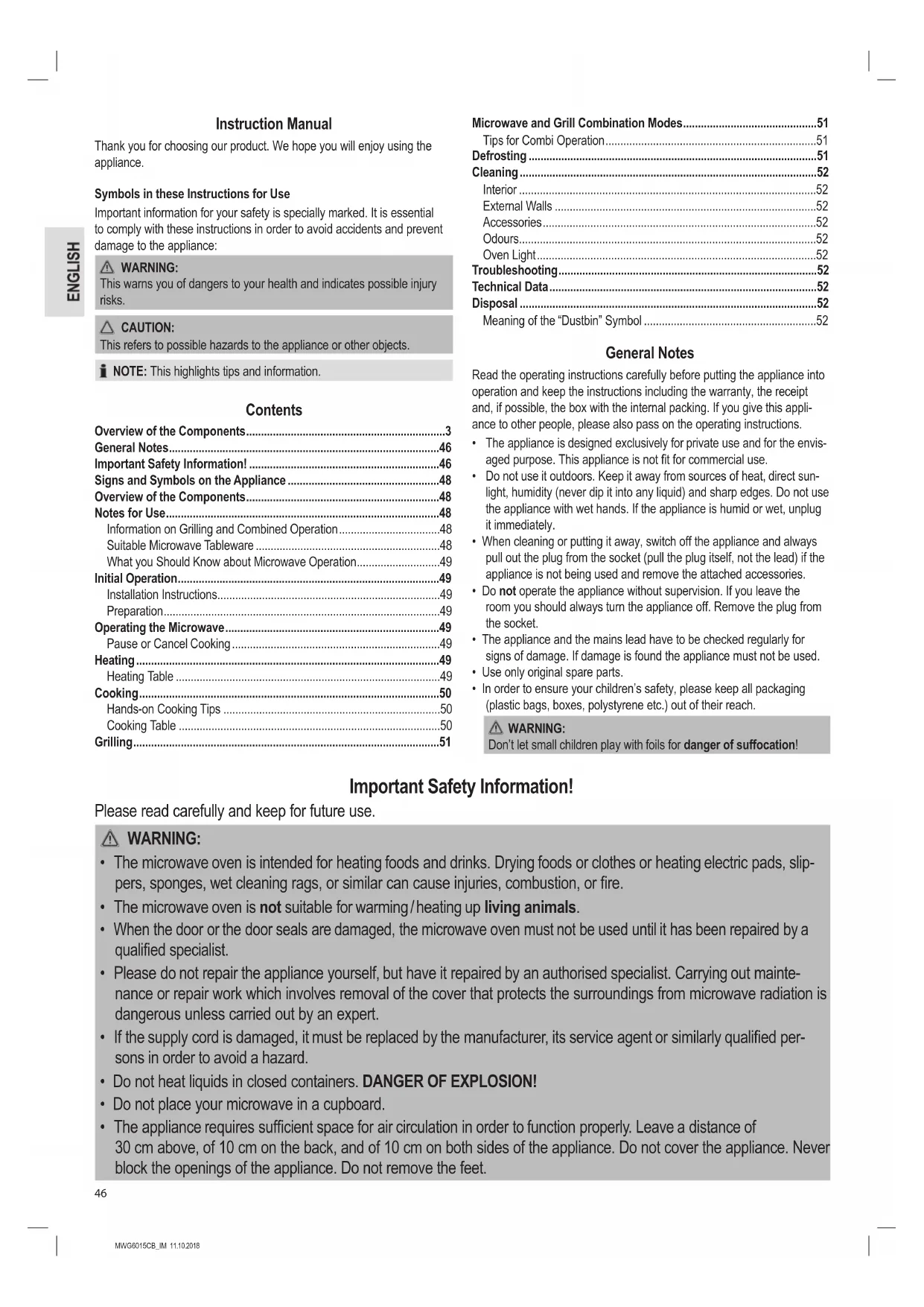 - Clean the grill after each use with a dishwashing detergent or place it in a dishwasher for cleaning. Odours In order to remove any unpleasant odours that may emanate from the mi- crowave, place a dish lled with water and lemon juice that is suitable for microwave use in the oven and heat it for approximately 5 minutes. Then wipe out the oven with a soft cloth. Oven Light If you need to replace the lighting in the oven, please contact a specialist workshop near you. Troubleshooting Malfunctions are often just caused due to minor problems. Before contacting our customer service, please check the table below: Problem Possible cause Notes / solution Radio or TV reception is interrupted during mi- crowave operation. The electromagnetic elds of this appliance might interfere with the pictures and sound of special frequencies. This is normal and not a malfunction. Position the appliances further away from each other. The microwave does not start. The door is not properly closed. Check if there are objects or food remains jammed in the door. Defect wall socket. Try another wall socket. Check the main fuse in your household. The turn-table causes a scratching or abradant noise. There are dirt or foreign objects in the area of the turntable shaft. Remove possible objects and food remains as described under “Cleaning”. The operation is terminated without any obvious reason. The appliance is defect. Please contact our customer service. Technical Data Model:....................................................................................MWG 6015 CB Power supply:.......................................................................... 230 V~, 50 Hz Power consumption: Microwave: ....................................................................................1150 W Grill:................................................................................................. 800 W Rated microwave power output: .......................................700 W / 2450 MHz Cavity volume:......................................................................approx. 20 litres Protection class: ........................................................................................... Net weight: ............................................................................ approx. 11.4 kg The right to make technical and design modications in the course of continuous product development remains reserved. This appliance has been tested according to all relevant current CE guide- lines, such as electromagnetic compatibility and low voltage directives, and has been constructed in accordance with the latest safety regulations. Disposal Meaning of the “Dustbin” Symbol Protect our environment: do not dispose of electrical equipment in the domestic waste. Please return any electrical equipment that you will no longer use to the collection points provided for their disposal. This helps avoid the potential effects of incorrect disposal on the environ- ment and human health. This will contribute to the recycling and other forms of re-utilisation of electrical and electronic equipment. Information concerning where the equipment can be disposed of can be obtained from your local authority.53
