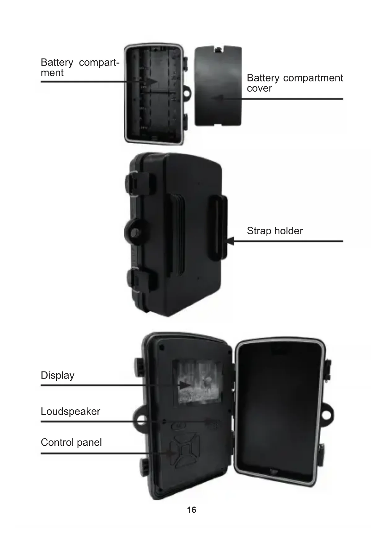 Infrared lamps Camera lense PIR-Sensor16 Battery compart- ment Battery compartment cover Strap holder Control panel Loudspeaker Display17