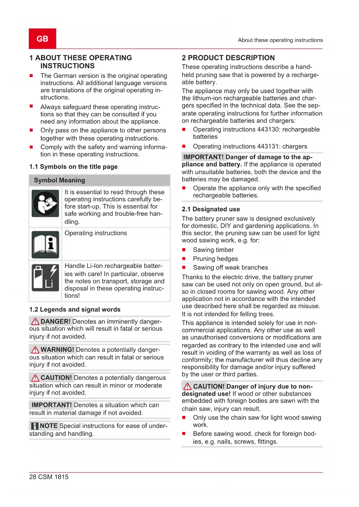 DANGER! Denotes an imminently danger- ous situation which will result in fatal or serious injury if not avoided. WARNING! Denotes a potentially danger- ous situation which can result in fatal or serious injury if not avoided. CAUTION! Denotes a potentially dangerous situation which can result in minor or moderate injury if not avoided. IMPORTANT! Denotes a situation which can result in material damage if not avoided. NOTE Special instructions for ease of under- standing and handling. 2 PRODUCT DESCRIPTION These operating instructions describe a hand- held pruning saw that is powered by a recharge- able battery. The appliance may only be used together with the lithium-ion rechargeable batteries and char- gers specified in the technical data. See the sep- arate operating instructions for further information on rechargeable batteries and chargers: