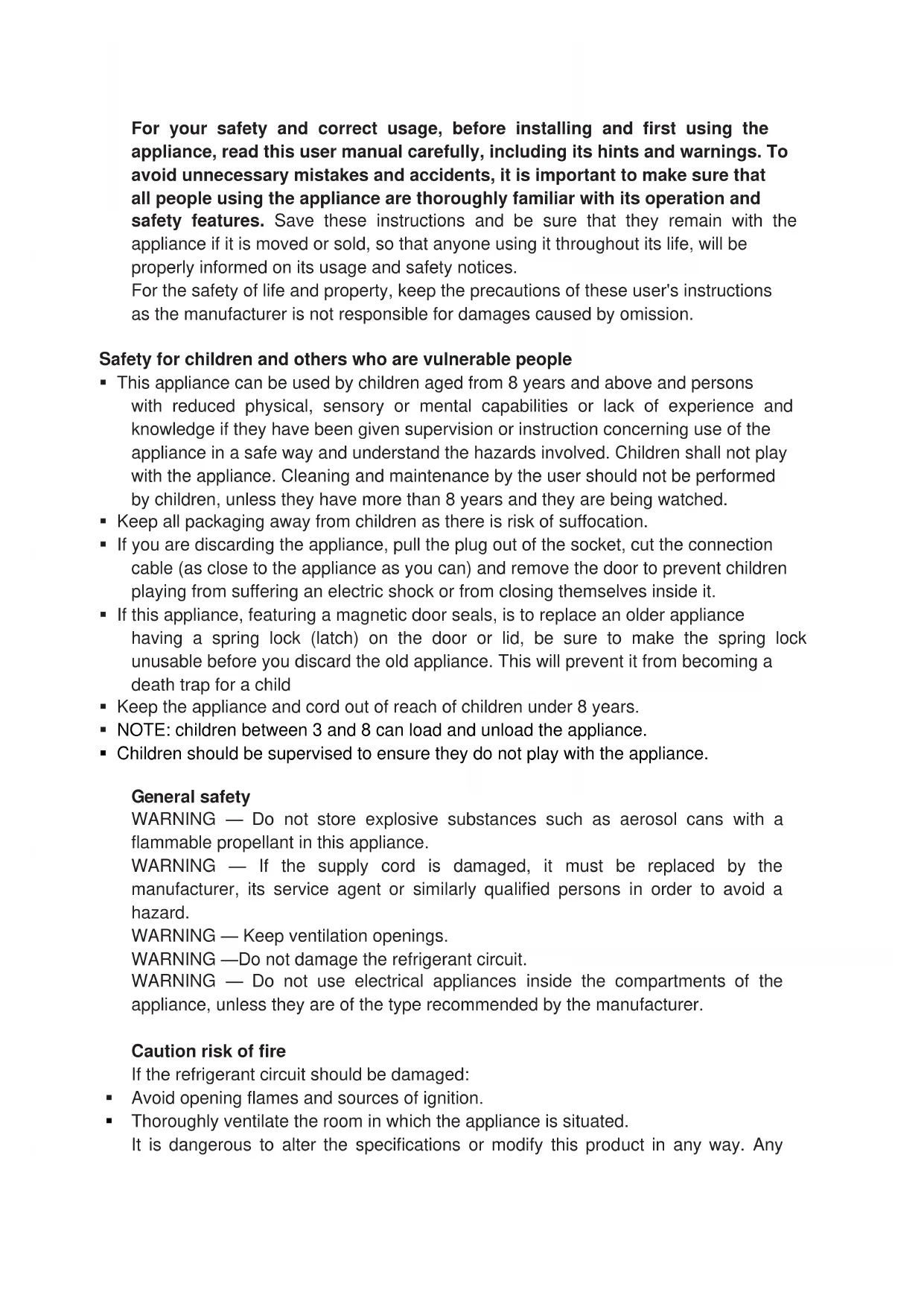 - Children should be supervised to ensure they do not play with the appliance. General safety WARNING — Do not store explosive substances such as aerosol cans with a flammable propellant in this appliance. WARNING — If the supply cord is damaged, it must be replaced by the manufacturer, its service agent or similarly qualified persons in order to avoid a hazard. WARNING — Keep ventilation openings. WARNING —Do not damage the refrigerant circuit. WARNING — Do not use electrical appliances inside the compartments of the appliance, unless they are of the type recommended by the manufacturer. Caution risk of fire If the refrigerant circuit should be damaged: