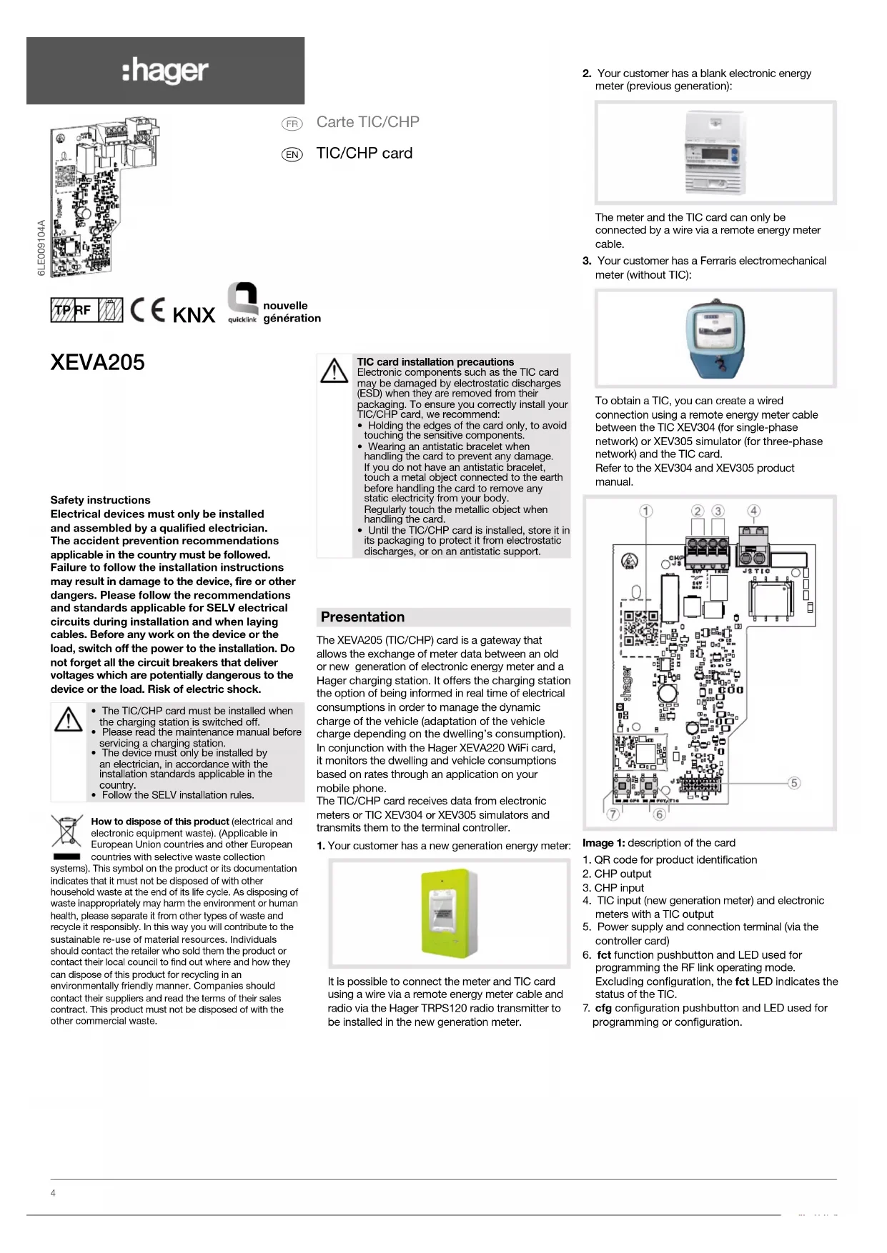 TIC/CHP card Safety instructionsElectrical devices must only be installed and assembled by a qualified electrician. The accident prevention recommendations applicable in the country must be followed. Failure to follow the installation instructions may result in damage to the device, fire or other dangers. Please follow the recommendations and standards applicable for SELV electrical circuits during installation and when laying cables. Before any work on the device or the load, switch off the power to the installation. Do not forget all the circuit breakers that deliver voltages which are potentially dangerous to the device or the load. Risk of electric shock.• The TIC/CHP card must be installed when the charging station is switched off.• Please read the maintenance manual before servicing a charging station.• The device must only be installed by an electrician, in accordance with the installation standards applicable in the country.• Follow the SELV installation rules.How to dispose of this product (electrical and electronic equipment waste). (Applicable in European Union countries and other European countries with selective waste collection systems). This symbol on the product or its documentation indicates that it must not be disposed of with other household waste at the end of its life cycle. As disposing of waste inappropriately may harm the environment or human health, please separate it from other types of waste and recycle it responsibly. In this way you will contribute to the sustainable re-use of material resources. Individuals should contact the retailer who sold them the product or contact their local council to find out where and how they can dispose of this product for recycling in an environmentally friendly manner. Companies should contact their suppliers and read the terms of their sales contract. This product must not be disposed of with the other commercial waste.TIC card installation precautionsElectronic components such as the TIC card may be damaged by electrostatic discharges (ESD) when they are removed from their packaging. To ensure you correctly install your TIC/CHP card, we recommend:• Holding the edges of the card only, to avoid touching the sensitive components.• Wearing an antistatic bracelet when handling the card to prevent any damage. If you do not have an antistatic bracelet, touch a metal object connected to the earth before handling the card to remove any static electricity from your body. Regularly touch the metallic object when handling the card.• Until the TIC/CHP card is installed, store it in its packaging to protect it from electrostatic discharges, or on an antistatic support. XEVA205 6LE009104A KNX TP RF nouvelle génération 4Function System information Detailed, specialised knowledge obtained from Hager through specific KNX training courses is required for full understanding of the system. These training courses are not necessary for this installation. “Quicklink” configuration The TIC XEVA205 card is compatible with the Hager TRPS120 radio transmitter, to be integrated into the new generation meter. Typical scenario