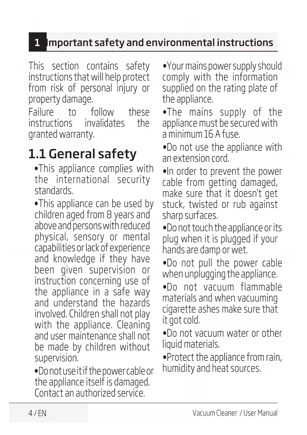 Vacuum Cleaner / User Manual 1 Important safety and environmental instructions This section contains safety instructions that will help protect from risk of personal injury or property damage. Failure to follow these instructions invalidates the granted warranty.