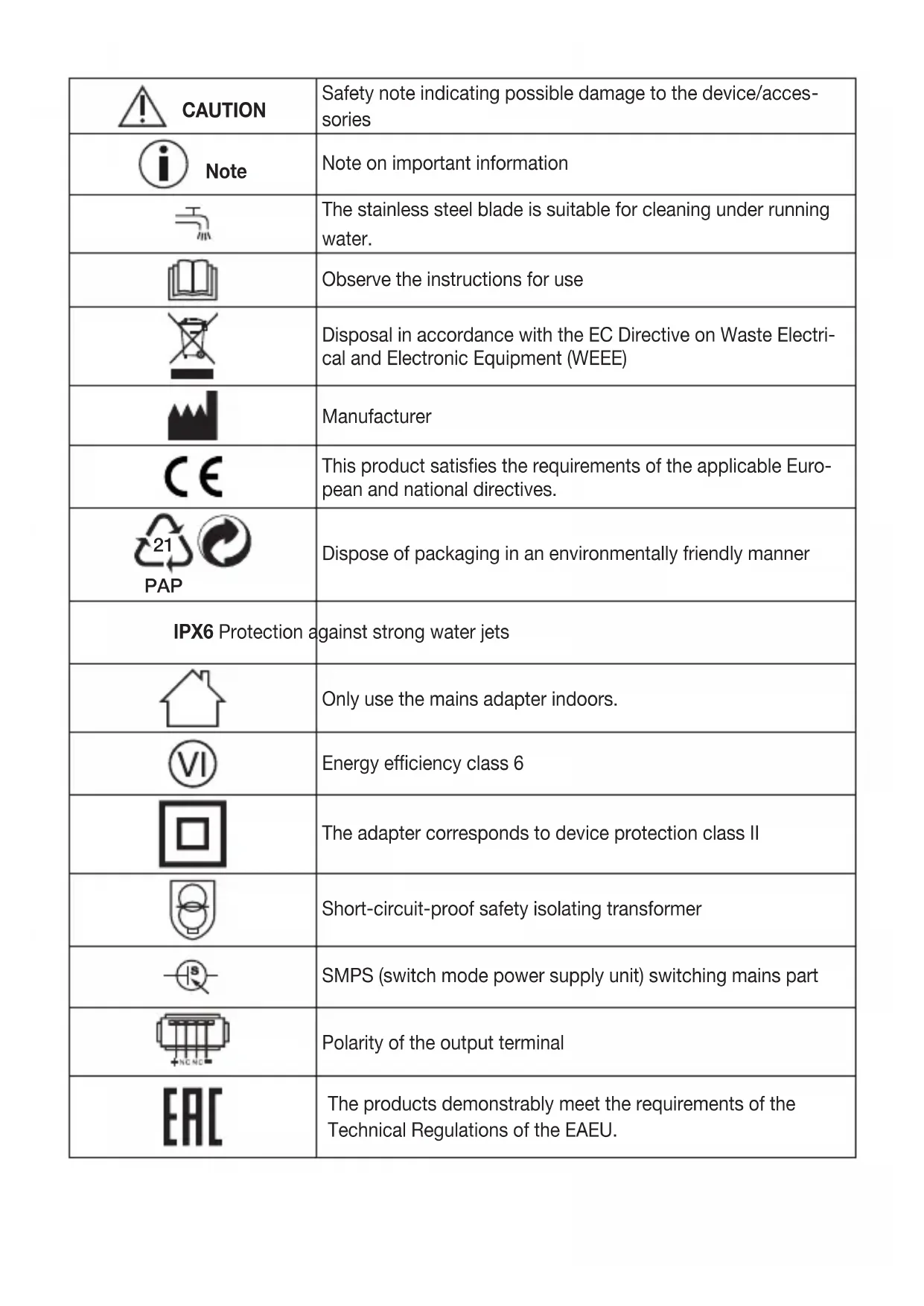 The following symbols are used in these instructions for use, on the packaging and on the type plate for the device: DANGER This device must not be used near to water or in water (e.g. in a wash basin, or in the shower or bath) – risk of electric shock! WARNING Warning notice indicating a risk of injury or damage to health18 19 CAUTION Safety note indicating possible damage to the device/acces