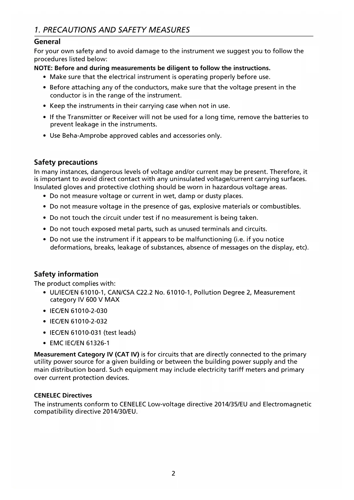- Use Beha-Amprobe approved cables and accessories only. Safety precautions In many instances, dangerous levels of voltage and/or current may be present. Therefore, it is important to avoid direct contact with any uninsulated voltage/current carrying surfaces. Insulated gloves and protective clothing should be worn in hazardous voltage areas.