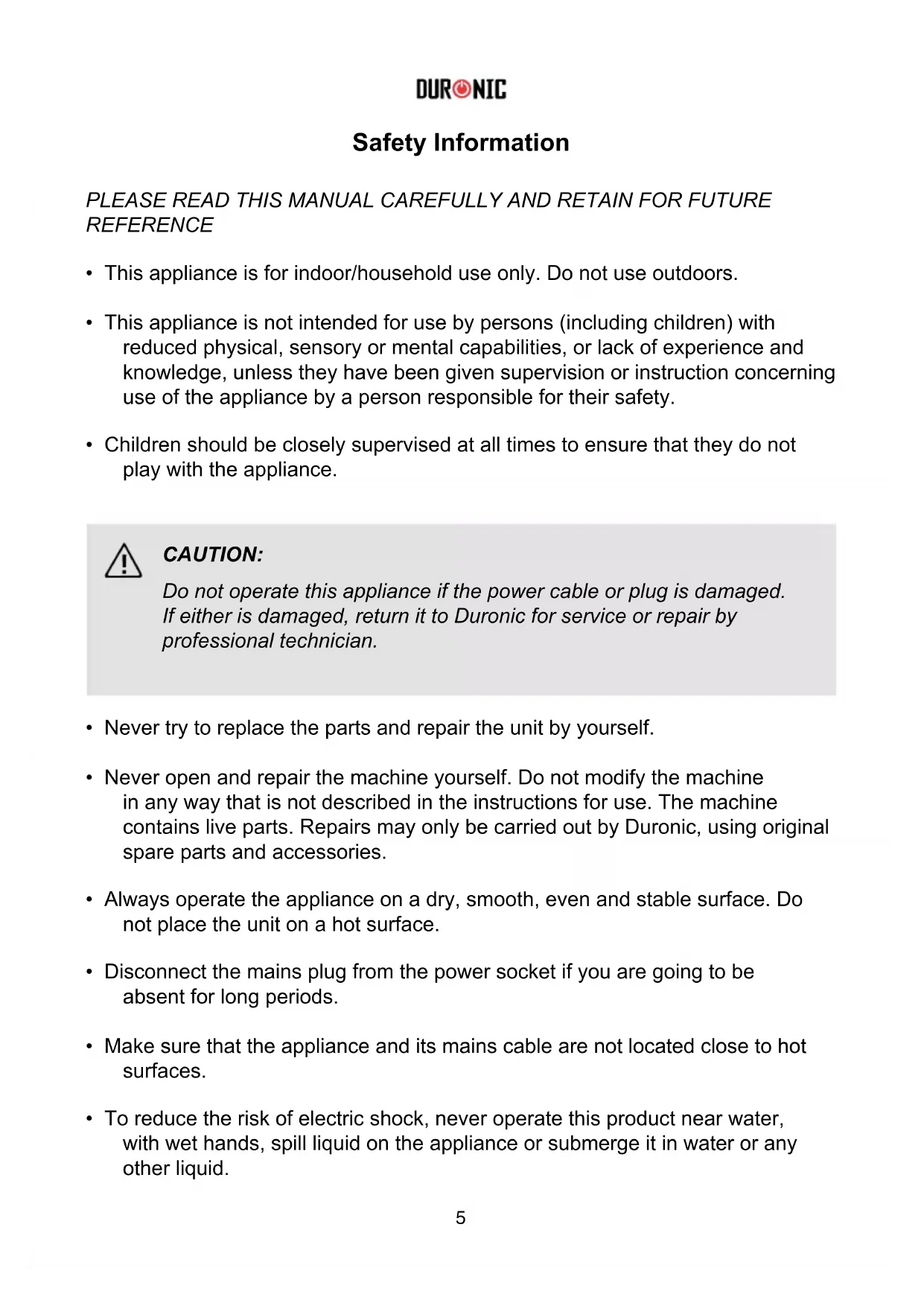 - To reduce the risk of electric shock, never operate this product near water, with wet hands, spill liquid on the appliance or submerge it in water or any other liquid. Safety Information CAUTION: Do not operate this appliance if the power cable or plug is damaged. If either is damaged, return it to Duronic for service or repair by professional technician.6