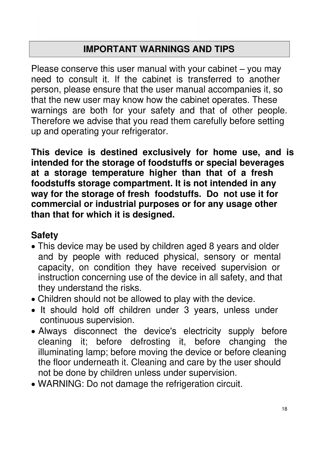 Please conserve this user manual with your cabinet – you may need to consult it. If the cabinet is transferred to another person, please ensure that the user manual accompanies it, so that the new user may know how the cabinet operates. These warnings are both for your safety and that of other people. Therefore we advise that you read them carefully before setting up and operating your refrigerator. This device is destined exclusively for home use, and is intended for the storage of foodstuffs or special beverages at a storage temperature higher than that of a fresh foodstuffs storage compartment. It is not intended in any way for the storage of fresh foodstuffs. Do not use it for commercial or industrial purposes or for any usage other than that for which it is designed. Safety This device may be used by children aged 8 years and older and by people with reduced physical, sensory or mental capacity, on condition they have received supervision or instruction concerning use of the device in all safety, and that they understand the risks. Children should not be allowed to play with the device. It should hold off children under 3 years, unless under continuous supervision. Always disconnect the device's electricity supply before cleaning it; before defrosting it, before changing the illuminating lamp; before moving the device or before cleaning the floor underneath it. Cleaning and care by the user should not be done by children unless under supervision.