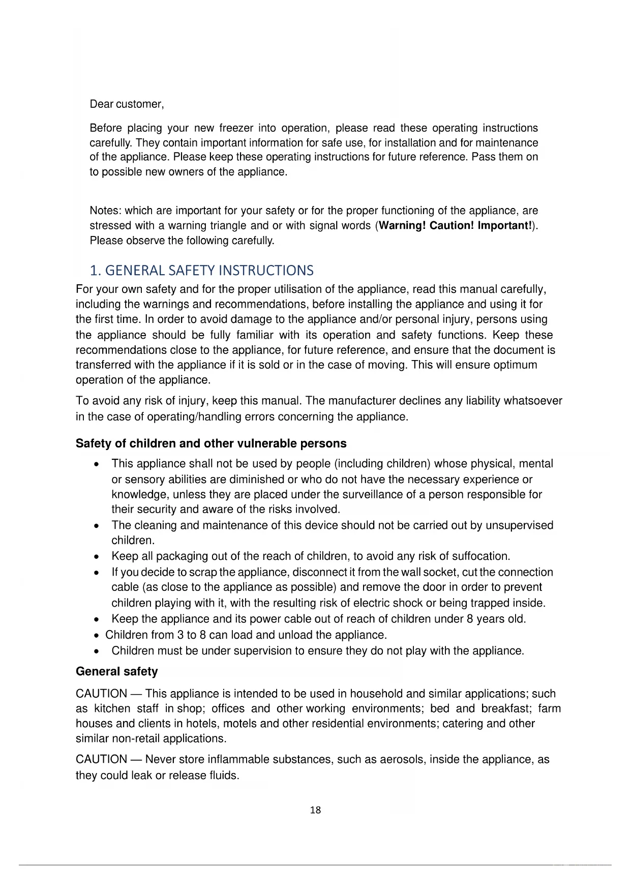For your own safety and for the proper utilisation of the appliance, read this manual carefully, including the warnings and recommendations, before installing the appliance and using it for the first time. In order to avoid damage to the appliance and/or personal injury, persons using the appliance should be fully familiar with its operation and safety functions. Keep these recommendations close to the appliance, for future reference, and ensure that the document is transferred with the appliance if it is sold or in the case of moving. This will ensure optimum operation of the appliance. To avoid any risk of injury, keep this manual. The manufacturer declines any liability whatsoever in the case of operating/handling errors concerning the appliance. Safety of children and other vulnerable persons