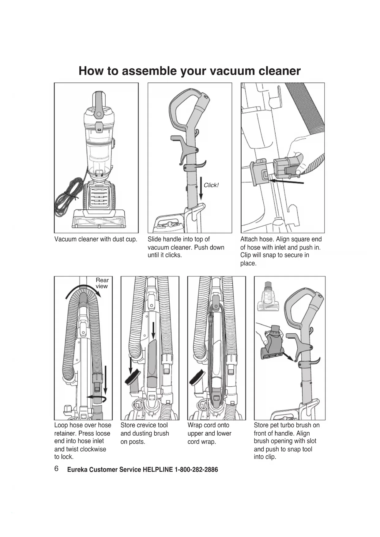 Inspection: Carefully unpack and inspect your new Eureka vacuum cleaner for shipping damage. Each unit is tested and thoroughly inspected before shipping. For instructions regarding any shipping damage, call the Eureka Customer Service HELPLINE at 1-800-282-2886 immediately.