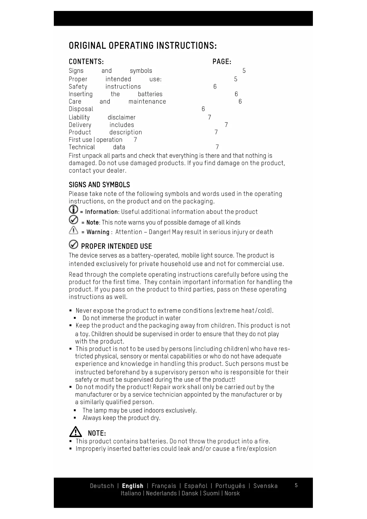 NOTE: § This product contains batteries. Do not throw the product into a fire. § Improperly inserted batteries could leak and/or cause a fire/explosion Deutsch | English | Français | Español | Português | Svenska Italiano | Nederlands | Dansk | Suomi | Norsk6 § Always change all of the batteries at the same time as a complete set and always use equivalent batteries § Keep batteries away from children > Risk of choking or suffocating § Never try to open, crush or heat a battery or set it on fire. § Do not use the batteries if the product appears to be damaged. § The batteries cannot be recharged! § Always dispose of used batteries & rechargeable batteries in accordance with the local regulations and requirements. § In the event of battery leakage, do not touch. If you come into contact with battery fluid, wash the affected area thoroughly and immediately with plenty of water. § If the battery fluid has caused a skin reaction or has come into contact with your eyes, contact a medical professional immediately. § Do not short-circuit the batteries! § Remove used or empty batteries from the lamp immediately § If the lamp can no longer be used, the batteries must be removed from the lamp before it is disposed of SAFETY INSTRUCTIONS