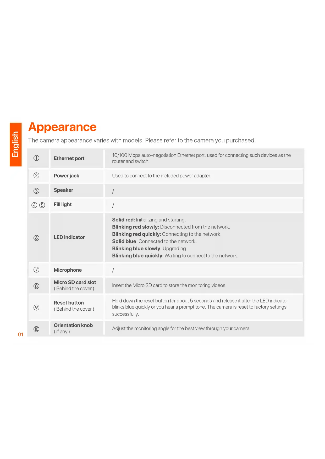Power jack Ethernet port Reset button ( Behind the cover ) Orientation knob ( if any ) Micro SD card slot ( Behind the cover ) Appearance The camera appearance varies with models. Please refer to the camera you purchased.02 English Add the camera to TDSEE App Tips Before adding your camera, ensure that the router is connected to the internet successfully and the filter function is disabled. Power on the camera. The LED indicator lights solid red after the camera is powered on. When the LED indicator blinks blue quickly, the camera is waiting to connect to a 2.4 GHz Wi-Fi network.