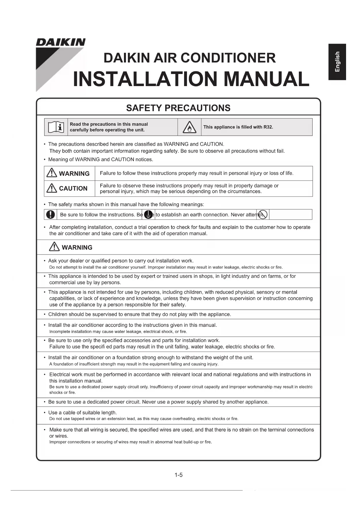 All dimensions are in mm1-5 English SAFETY PRECAUTIONS Read the precautions in this manualcarefully before operating the unit.This appliance is filled with R32.• The precautions described herein are classified as WARNING and CAUTION.They both contain important information regarding safety. Be sure to observe all precautions without fail.• Meaning of WARNING and CAUTION notices. WARNING Failure to follow these instructions properly may result in personal injury or loss of life. CAUTION Failure to observe these instructions properly may result in property damage orpersonal injury, which may be serious depending on the circumstances.• The safety marks shown in this manual have the following meanings:Be sure to follow the instructions. Be sure to establish an earth connection. Never attempt.