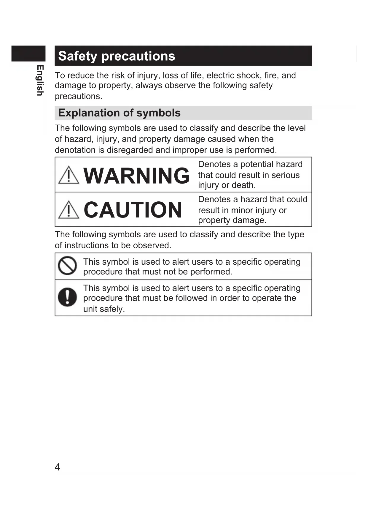 - Specications PB016722 - ER-GN70_(01GB)_07-30-18.indd 3 2018/7/30 16:29:414 English Safety precautions To reduce the risk of injury, loss of life, electric shock, re, and damage to property, always observe the following safety precautions. Explanation of symbols The following symbols are used to classify and describe the level of hazard, injury, and property damage caused when the denotation is disregarded and improper use is performed. WARNING Denotes a potential hazard that could result in serious injury or death. CAUTION Denotes a hazard that could result in minor injury or property damage. The following symbols are used to classify and describe the type of instructions to be observed. This symbol is used to alert users to a specic operating procedure that must not be performed. This symbol is used to alert users to a specic operating procedure that must be followed in order to operate the unit safely. PB016722 - ER-GN70_(01GB)_07-30-18.indd 4 2018/7/30 16:29:415 English WARNING This product Do not store within reach of children or infants. Do not let them use it. - Putting parts or accessories in the mouth may cause an accident or injury. p. 17