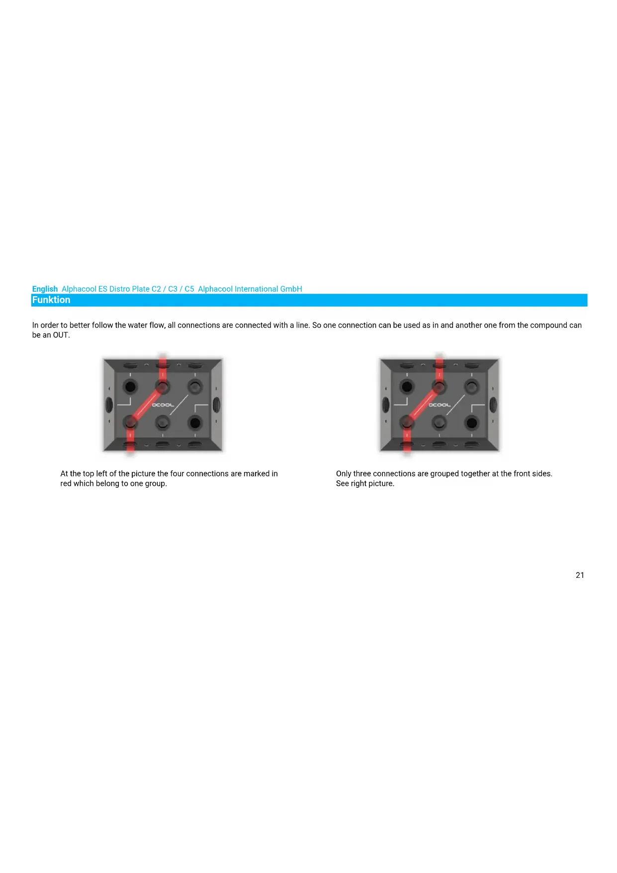 At the top left of the picture the four connections are marked in red which belong to one group. Only three connections are grouped together at the front sides. See right picture.Alphacool International GmbH Alphacool ES Distro Plate C2 / C3 / C5 English
