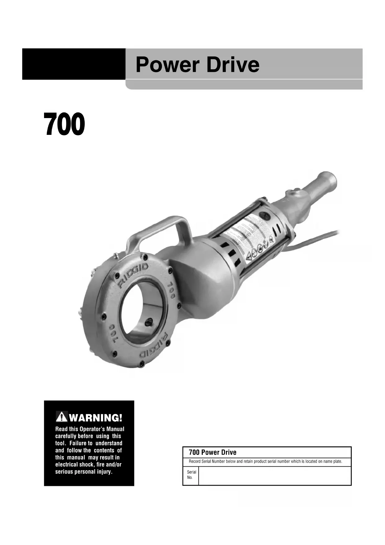 Die HeadThreaded Pipe(Throat in Down Position) UpOptional Equipment WARNING To reduce the risk of serious injury, only use equip- ment specifically designed and recommended for use with the 700 Power Drive such as those listed below. Further information on equipment available for 700 Power Drive specic to the tool can be found in the RIDGID Catalog and online at RIDGID.com. Machine Storage The 700 Power Drive must be kept indoors or well covered in rainy weather. Store the machine in a locked area that is out of reach of children and people unfa- miliar with the machines. This machine can cause serious injury in the hands of untrained users. Service And Repair WARNING Improper service or repair can make machine unsafe to operate. The Maintenance Instructions will take care of most of the service needs of this machine. Any problems not ad - dressed by this section should only be handled by an authorized RIDGID service technician. Tool should be taken to a RIDGID Independent Service Center or returned to the factory. Use only RIDGID service parts. For information on your nearest RIDGID Independent Service Center or any service or repair questions: