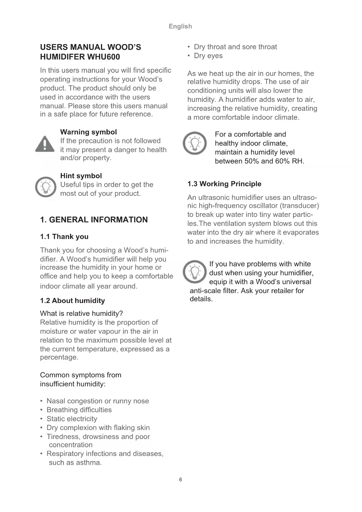 HUMIDIFER WHU600 In this users manual you will nd specic operating instructions for your Wood’s product. The product should only be used in accordance with the users manual. Please store this users manual in a safe place for future reference. Warning symbol If the precaution is not followed it may present a danger to health and/or property. Hint symbol Useful tips in order to get the most out of your product.