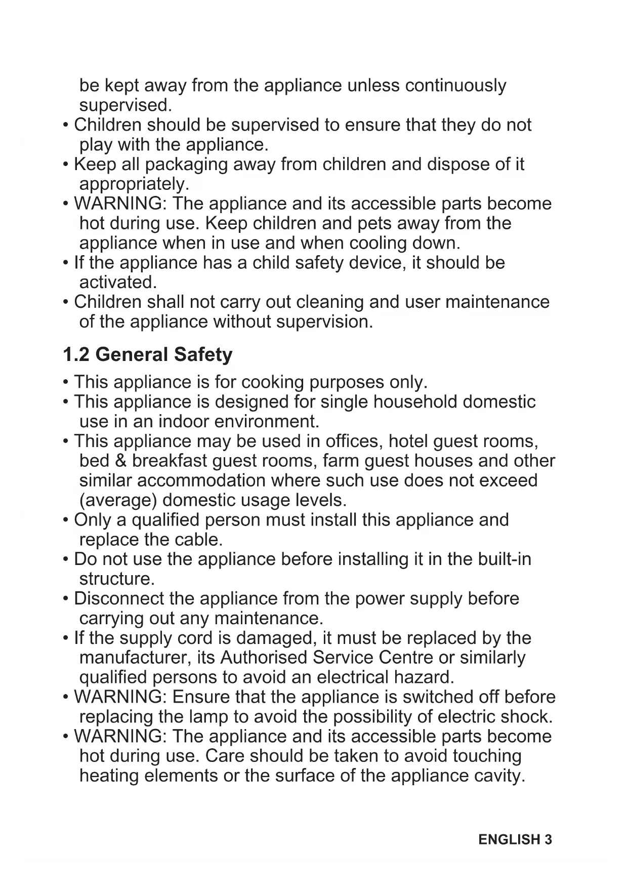 - WARNING: The appliance and its accessible parts become hot during use. Care should be taken to avoid touching heating elements or the surface of the appliance cavity. ENGLISH 3• Always use oven gloves to remove or insert accessories or ovenware.