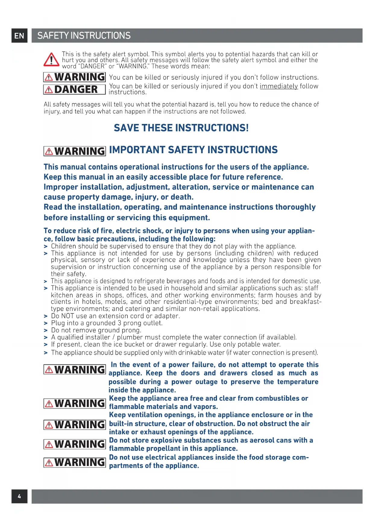 This manual contains operational instructions for the users of the appliance. Keep this manual in an easily accessible place for future reference. Improper installation, adjustment, alteration, service or maintenance can cause property damage, injury, or death. Read the installation, operating, and maintenance instructions thoroughly before installing or servicing this equipment. To reduce risk of fire, electric shock, or injury to persons when using your applian-ce, follow basic precautions, including the following: > Children should be supervised to ensure that they do not play with the appliance. > This appliance is not intended for use by persons (including children) with reduced physical, sensory or lack of experience and knowledge unless they have been given supervision or instruction concerning use of the appliance by a person responsible for their safety. > This appliance is designed to refrigerate beverages and foods and is intended for domestic use. > This appliance is intended to be used in household and similar applications such as: sta kitchen areas in shops, oces, and other working environments; farm houses and by clients in hotels, motels, and other residential-type environments; bed and breakfast-type environments; and catering and similar non-retail applications.> Do NOT use an extension cord or adapter.> Plug into a grounded 3 prong outlet.> Do not remove ground prong. > A qualified installer / plumber must complete the water connection (if available). > If present, clean the ice bucket or drawer regularly. Use only potable water. > The appliance should be supplied only with drinkable water (if water connection is present). WARNING