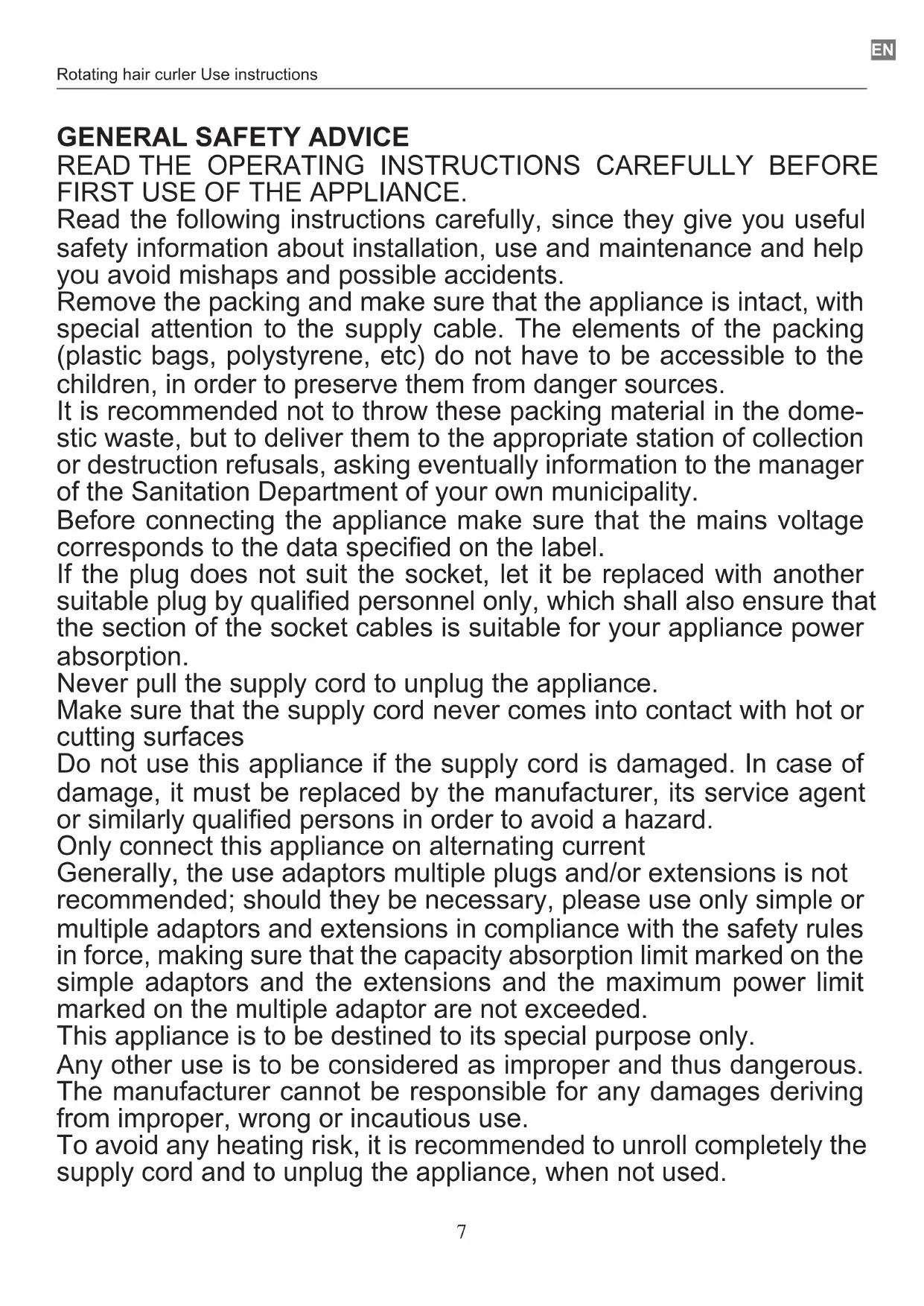 FIRST USE OF THE APPLIANCE. Read the following instructions carefully, since they give you useful safety information about installation, use and maintenance and help you avoid mishaps and possible accidents. Remove the packing and make sure that the appliance is intact, with special attention to the supply cable. The elements of the packing (plastic bags, polystyrene, etc) do not have to be accessible to the children, in order to preserve them from danger sources. It is recommended not to throw these packing material in the dome- stic waste, but to deliver them to the appropriate station of collection or destruction refusals, asking eventually information to the manager of the Sanitation Department of your own municipality. Before connecting the appliance make sure that the mains voltage corresponds to the data specied on the label. If the plug does not suit the socket, let it be replaced with another suitable plug by qualied personnel only, which shall also ensure that the section of the socket cables is suitable for your appliance power absorption. Never pull the supply cord to unplug the appliance. Make sure that the supply cord never comes into contact with hot or cutting surfaces Do not use this appliance if the supply cord is damaged. In case of damage, it must be replaced by the manufacturer, its service agent or similarly qualied persons in order to avoid a hazard. Only connect this appliance on alternating current Generally, the use adaptors multiple plugs and/or extensions is not recommended; should they be necessary, please use only simple or multiple adaptors and extensions in compliance with the safety rules in force, making sure that the capacity absorption limit marked on the simple adaptors and the extensions and the maximum power limit marked on the multiple adaptor are not exceeded. This appliance is to be destined to its special purpose only. Any other use is to be considered as improper and thus dangerous. The manufacturer cannot be responsible for any damages deriving from improper, wrong or incautious use. To avoid any heating risk, it is recommended to unroll completely the supply cord and to unplug the appliance, when not used.8 Rotating hair curler Use instructions Before cleaning, always unplug the appliance. To protect against electric shock, do not immerse cord, plug or any parts of the appliance into water or other uids. Do not hold the appliance with wet hands or feet. Do not hold the appliance with naked feet. Do not expose the appliance to atmospheric agents such as rain, wind, snow, hail. Do not use the appliance near explosives, highly ammable mate- rials, gases, burning ames, heaters. Do not allow children, disabled people or every people without expe- rience or technical ability to use the appliance if they are not properly watched over. Close supervision is necessary when any appliance used by or near children. Make sure that children do not play with this appliance. If you decide not to use the appliance any longer, make it unservice- able by simply cutting the supply cable after disconnecting the plug from the socket.