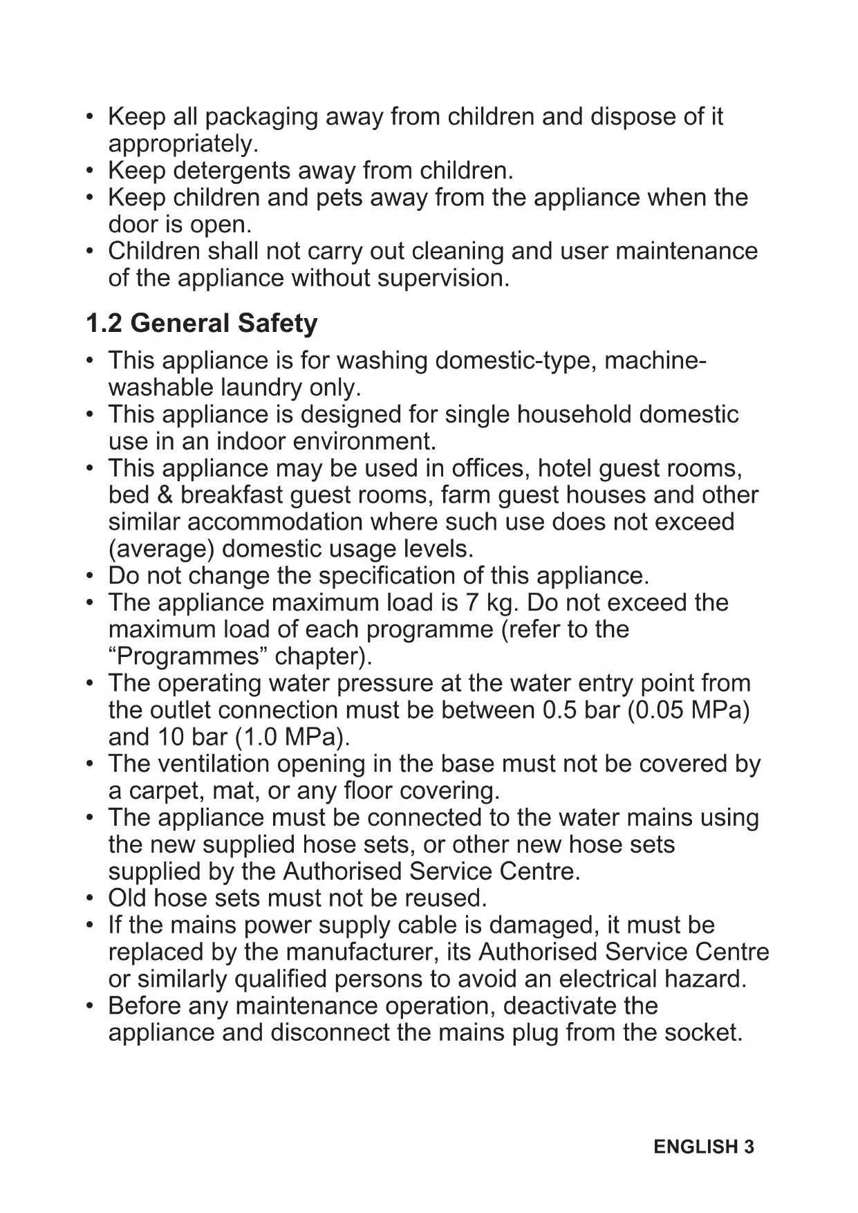 - The appliance maximum load is 7kg . Do not exceed the maximum load of each programme (refer to the "Programmes" chapter).