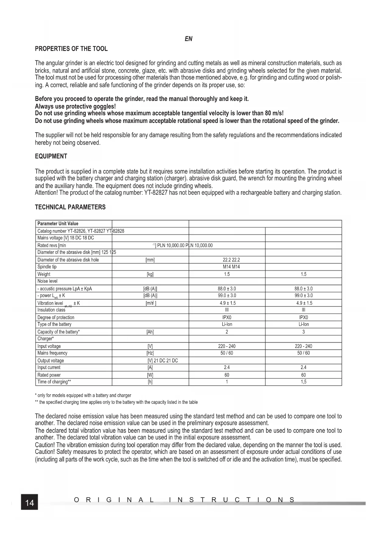 The angular grinder is an electric tool designed for grinding and cutting metals as well as mineral construction materials, such as bricks, natural and artifi cial stone, concrete, glaze, etc. with abrasive disks and grinding wheels selected for the given material. The tool must not be used for processing other materials than those mentioned above, e.g. for grinding and cutting wood or polish- ing. A correct, reliable and safe functioning of the grinder depends on its proper use, so: Before you proceed to operate the grinder, read the manual thoroughly and keep it. Always use protective goggles! Do not use grinding wheels whose maximum acceptable tangential velocity is lower than 80 m/s! Do not use grinding wheels whose maximum acceptable rotational speed is lower than the rotational speed of the grinder. The supplier will not be held responsible for any damage resulting from the safety regulations and the recommendations indicated hereby not being observed. EQUIPMENT The product is supplied in a complete state but it requires some installation activities before starting its operation. The product is supplied with the battery charger and charging station (charger). abrasive disk guard, the wrench for mounting the grinding wheel and the auxiliary handle. The equipment does not include grinding wheels. Attention! The product of the catalog number: YT-82827 has not been equipped with a rechargeable battery and charging station. TECHNICAL PARAMETERS Parameter Unit Value Catalog number YT-82826, YT-82827 YT-82828 Mains voltage [V] 18 DC 18 DC Rated revs [min
