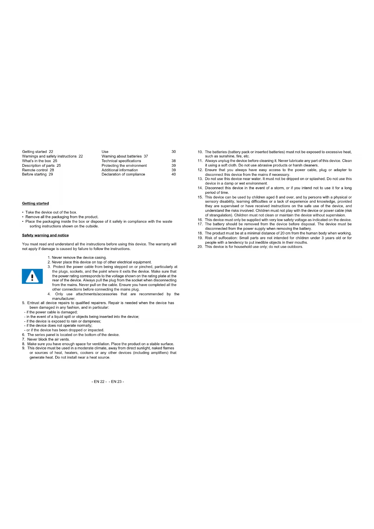 or sources of heat, heaters, cookers or any other devices (including amplifiers) that generate heat. Do not install near a heat source. Getting started 22 Warnings and safety instructions 22 What's in the box 25 Description of parts 25 Remote control 28 Before starting 29 Use 30 Warning about batteries 37 Technical specifications 38 Protecting the environment 39 Additional information 39 Declaration of compliance 40- EN 24 - - EN 25 - Package contents Check and identify the contents of your box: