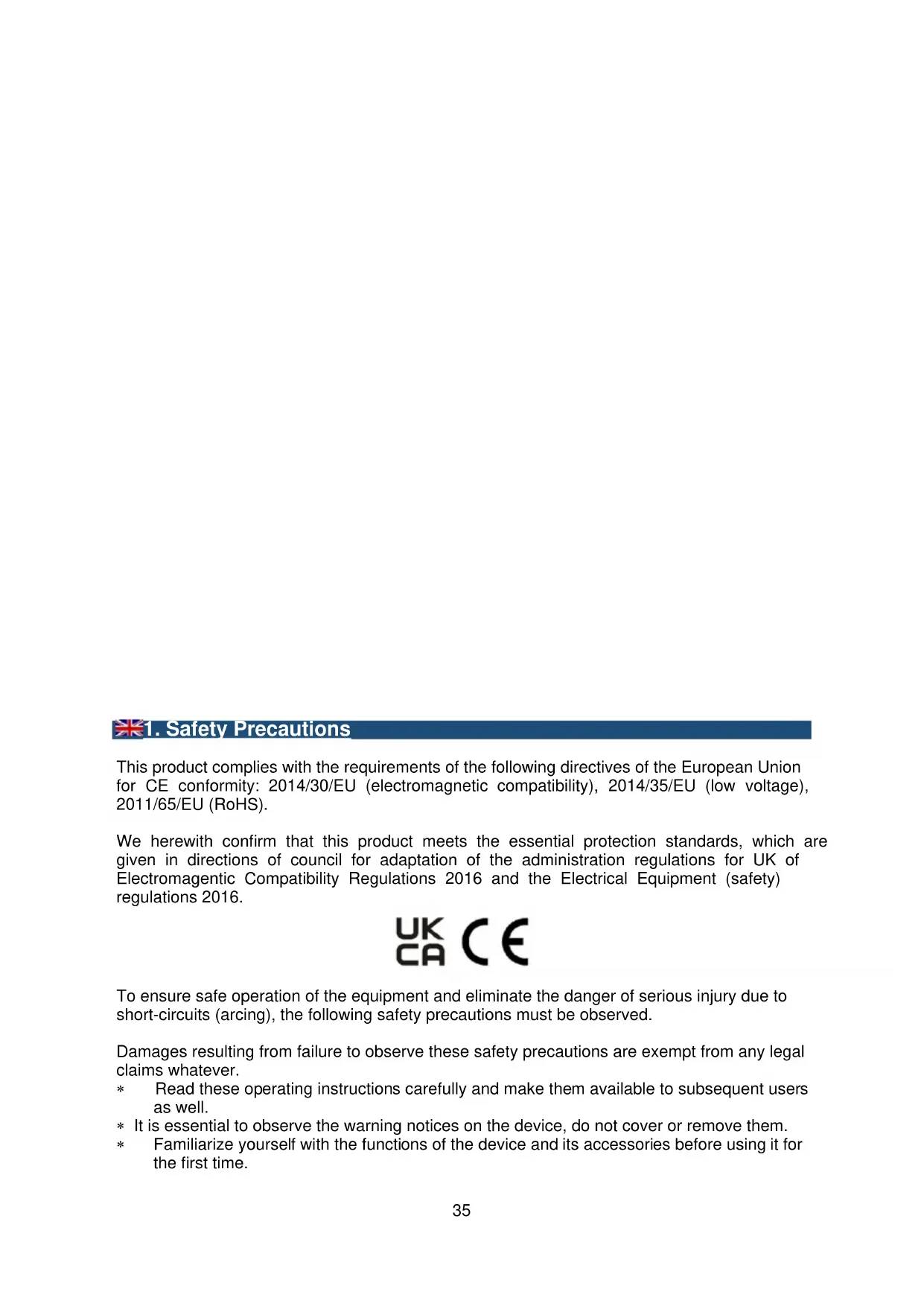 This product complies with the requirements of the following directives of the European Union for CE conformity: 2014/30/EU (electromagnetic compatibility), 2014/35/EU (low voltage), 2011/65/EU (RoHS). We herewith confirm that this product meets the essential protection standards, which are given in directions of council for adaptation of the administration regulations for UK of Electromagentic Compatibility Regulations 2016 and the Electrical Equipment (safety) regulations 2016. To ensure safe operation of the equipment and eliminate the danger of serious injury due to short-circuits (arcing), the following safety precautions must be observed. Damages resulting from failure to observe these safety precautions are exempt from any legal claims whatever. Read these operating instructions carefully and make them available to subsequent users as well. It is essential to observe the warning notices on the device, do not cover or remove them. Familiarize yourself with the functions of the device and its accessories before using it for the first time.36 Do not operate the device unsupervised or only protected against unauthorized access. Use the device only for the purpose of its intended use and pay particular attention to the warning notices on the device and information on the maximum input and output values. Before connecting the device to a socket, check that the voltage setting on the device corresponds to the existing mains voltage Only connect the device to sockets with an earthed neutral conductor. Do not place the device on a damp or wet surface. It is essential to keep the ventilation slots in the housing free (if the cover is covered, there is a risk of heat build-up inside the device). Do not insert any metal objects through the ventilation slots. Do not place any liquids on the device (risk of short circuit if it tips over). Never use the device if it is not completely closed. Replace defective fuses only with a fuse that corresponds to the original value. Never short-circuit the fuse or fuse holder. Check the device and accessories for possible damage or bare or kinked cables and wires before commissioning. If in doubt, do not take any measurements. It is essential to observe the warning notices on the device. Do not expose the device to extreme temperatures, direct sunlight, extreme humidity or moisture. Avoid strong vibrations. Do not operate the device near strong magnetic fields (motors, transformers, etc.). Clean the housing regularly with a damp cloth and a mild cleaning agent. Do not use any corrosive abrasives. This device is only suitable for indoor use only. Avoid any proximity to explosive and flammable substances. Opening the device and maintenance and repair work may only be carried out by qualified service technicians. Never short-circuit the remote sensor connections Do not make any technical changes to the device. Cleaning the cabinet Prior to cleaning the cabinet, withdraw the mains plug from the power outlet. Clean only with a damp, soft cloth and a commercially available mild household cleanser. Ensure that no water gets inside the equipment to prevent possible shorts and damage to the equipment. 1.1. Introduction The models PeakTech
