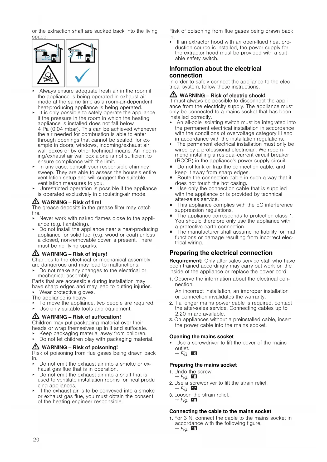 General information ¡ Read this instruction manual carefully. ¡ Only a licensed expert may connect the appliance. ¡ Switch off the power supply before carry- ing out any work. ¡ Never use this appliance in boats or in vehicles. ¡ Follow the worktop manufacturer's recom- mendations. Safe installation Follow these safety instructions when installing the appliance. The appliance can only be used safely if it is cor- rectly installed according to the safety instructions. The installer is responsible for ensuring that the ap- pliance works perfectly at its installation location. WARNING‒Danger: Magnetism! The appliance contains permanent magnets. They may affect electronic implants, e.g. pacemakers or insulin pumps. ▶ Persons with electronic implants must stand at least 10cm away from the appliance. WARNING‒Risk of poisoning! Risk of poisoning from flue gases being drawn back in. Room-air-dependent heat-producing appliances (e.g. gas, oil, wood or coal-operated heaters, con- tinuous flow heaters or water heaters) obtain com- bustion air from the room in which they are installed and discharge the exhaust gases into the open through an exhaust gas system (e.g. a chimney). With the extractor hood switched on, air is extracted from the kitchen and the adjacent rooms. Without an adequate supply of air, the air pressure falls below atmospheric pressure. Toxic gases from the chimney20 or the extraction shaft are sucked back into the living space. ▶ Always ensure adequate fresh air in the room if the appliance is being operated in exhaust air mode at the same time as a room-air-dependent heat-producing appliance is being operated. ▶ It is only possible to safely operate the appliance if the pressure in the room in which the heating appliance is installed does not fall below 4Pa(0.04mbar). This can be achieved whenever the air needed for combustion is able to enter through openings that cannot be sealed, for ex- ample in doors, windows, incoming/exhaust air wall boxes or by other technical means. An incom- ing/exhaust air wall box alone is not sufficient to ensure compliance with the limit. ▶ In any case, consult your responsible chimney sweep. They are able to assess the house's entire ventilation setup and will suggest the suitable ventilation measures to you. ▶ Unrestricted operation is possible if the appliance is operated exclusively in circulating-air mode. WARNING‒Risk of fire! The grease deposits in the grease filter may catch fire. ▶ Never work with naked flames close to the appli- ance (e.g. flambéing). ▶ Do not install the appliance near a heat-producing appliance for solid fuel (e.g. wood or coal) unless a closed, non-removable cover is present. There must be no flying sparks. WARNING‒Risk of injury! Changes to the electrical or mechanical assembly are dangerous and may lead to malfunctions. ▶ Do not make any changes to the electrical or mechanical assembly. Parts that are accessible during installation may have sharp edges and may lead to cutting injuries. ▶ Wear protective gloves. The appliance is heavy. ▶ To move the appliance, twopeople are required. ▶ Use only suitable tools and equipment. WARNING‒Risk of suffocation! Children may put packaging material over their heads or wrap themselves up in it and suffocate. ▶ Keep packaging material away from children. ▶ Do not let children play with packaging material. WARNING‒Risk of poisoning! Risk of poisoning from flue gases being drawn back in. ▶ Do not emit the exhaust air into a smoke or ex- haust gas flue that is in operation. ▶ Do not emit the exhaust air into a shaft that is used to ventilate installation rooms for heat-produ- cing appliances. ▶ If the exhaust air is to be conveyed into a smoke or exhaust gas flue, you must obtain the consent of the heating engineer responsible. Risk of poisoning from flue gases being drawn back in. ▶ If an extractor hood with an open-flued heat pro- duction source is installed, the power supply for the extractor hood must be provided with a suit- able safety switch. Information about the electrical connection In order to safely connect the appliance to the elec- trical system, follow these instructions. WARNING‒Risk of electric shock! It must always be possible to disconnect the appli- ance from the electricity supply. The appliance must only be connected to a mains socket that has been installed correctly. ▶ An all-pole isolating switch must be integrated into the permanent electrical installation in accordance with the conditions of overvoltage category III and in accordance with the installation regulations. ▶ The permanent electrical installation must only be wired by a professional electrician. We recom- mend installing a residual-current circuit breaker (RCCB) in the appliance's power supply circuit. ¡ Do not kink or trap the connection cable, and keep it away from sharp edges. ¡ Route the connection cable in such a way that it does not touch the hot casing. ¡ Use only the connection cable that is supplied with the appliance or is provided by technical after-sales service. ¡ This appliance complies with the EC interference suppression regulations. ¡ The appliance corresponds to protection class 1. You should therefore only use the appliance with a protective earth connection. ¡ The manufacturer shall assume no liability for mal- functions or damage resulting from incorrect elec- trical wiring. Preparing the electrical connection Requirement:Only after-sales service staff who have been trained accordingly may carry out work on the inside of the appliance or replace the power cord.