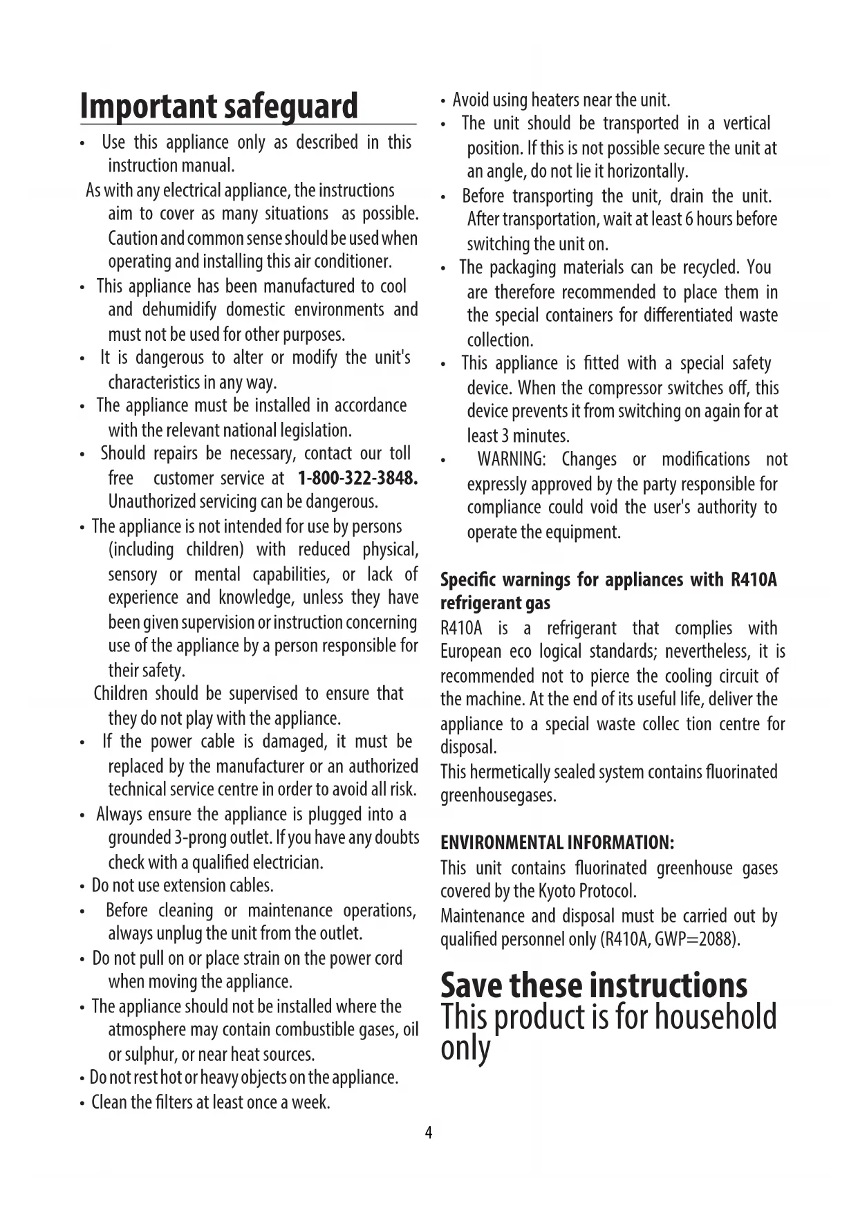 When the appliance is empty, replace the cap. Clean the lter and dry thoroughly before putting back. TECHNICAL SPECIFICATIONS Power supply voltage see rating label Max. absorbed power during air conditioning “ Refrigerant “ Cooling capacity “ LIMIT CONDITIONS Room temperature for air conditioning 64 ÷ 95°F (18° ÷ 35°C) Room temperature for heating (on some models only) 50 ÷ 77°F (10 ÷ 25°C) Transport, lling, cleaning, recovery and disposal of refrigerant should be performed by a technical service centre appointed by the manufacturer only. The appliance should be disposed of by a specialist centre appointed by the manufacturer only. TO AVOID DAMAGE TO THE UNIT: NEVER TRANSPORT OR TURN THE APPLIANCE UPSIDE DOWN OR ON ITS SIDE. IF THIS OCCURS, WAIT 6 HOURS BEFORE TURNING THE APPLIANCE ON, 24 HOURS IS RECOMMENDED. After the unit has been on its side, oil needs to return to the compressor to en- sure proper function. Without allowing the unit this time (6-24 hours) the unit may function for only a short time, and then the compressor will break down from lack of oil. ELECTRICAL CONNECTION This appliance is equipped with a 3 prong grounded plug. The plug must be connected into an outlet that is properly installed and grounded in the accordance with all local codes and ordi- nances. Do not modify the plug provided with the appliance. If it will not t the outlet, have a proper outlet installed by a qualied electrician or relocate the unit to a proper outlet. If the household electrical supply does not meet the above specica- tions, or if you are not sure your home has an eective electrical ground, have a qualied electrician or your local electrical utility company check it and correct any problems. SAFETY PLUG The appliance is tted with a safety plug to protect the power cable. If power is cut o, unplug from the outlet and make sure the power cable is undamaged. If the cable is damaged, call the service center immediately. If power cuts o frequently and the power cable is undamaged, contact a qualied electrician.