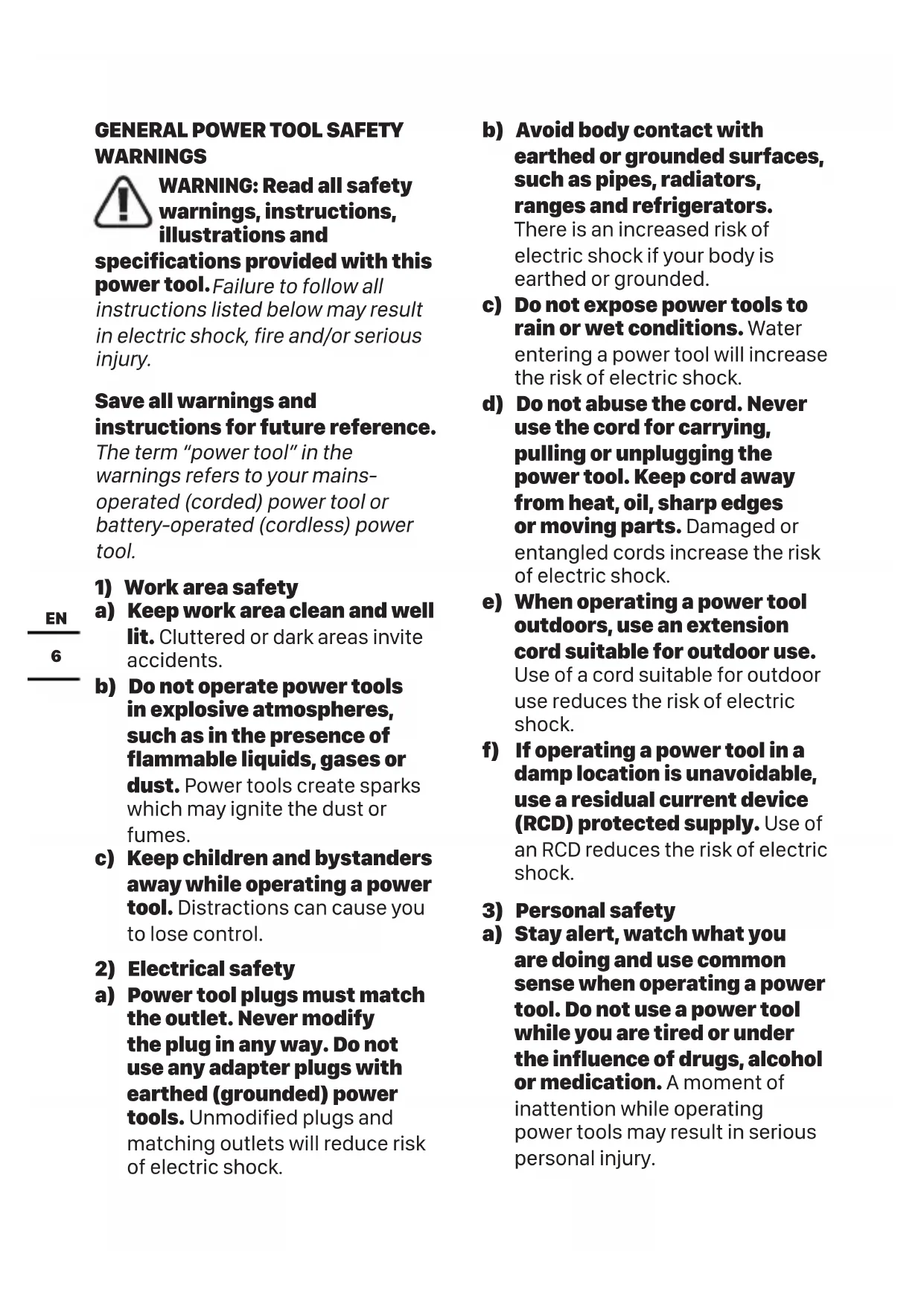 a) Power tool plugs must match the outlet. Never modify the plug in any way. Do not use any adapter plugs with earthed (grounded) power tools. Unmodified plugs and matching outlets will reduce risk of electric shock. b) Avoid body contact with earthed or grounded surfaces, such as pipes, radiators, ranges and refrigerators. There is an increased risk of electric shock if your body is earthed or grounded. c) Do not expose power tools to rain or wet conditions. Water entering a power tool will increase the risk of electric shock. d) Do not abuse the cord. Never use the cord for carrying, pulling or unplugging the power tool. Keep cord away from heat, oil, sharp edges or moving parts. Damaged or entangled cords increase the risk of electric shock. e) When operating a power tool outdoors, use an extension cord suitable for outdoor use. Use of a cord suitable for outdoor use reduces the risk of electric shock. f) If operating a power tool in a damp location is unavoidable, use a residual current device (RCD) protected supply. Use of an RCD reduces the risk of electric shock.