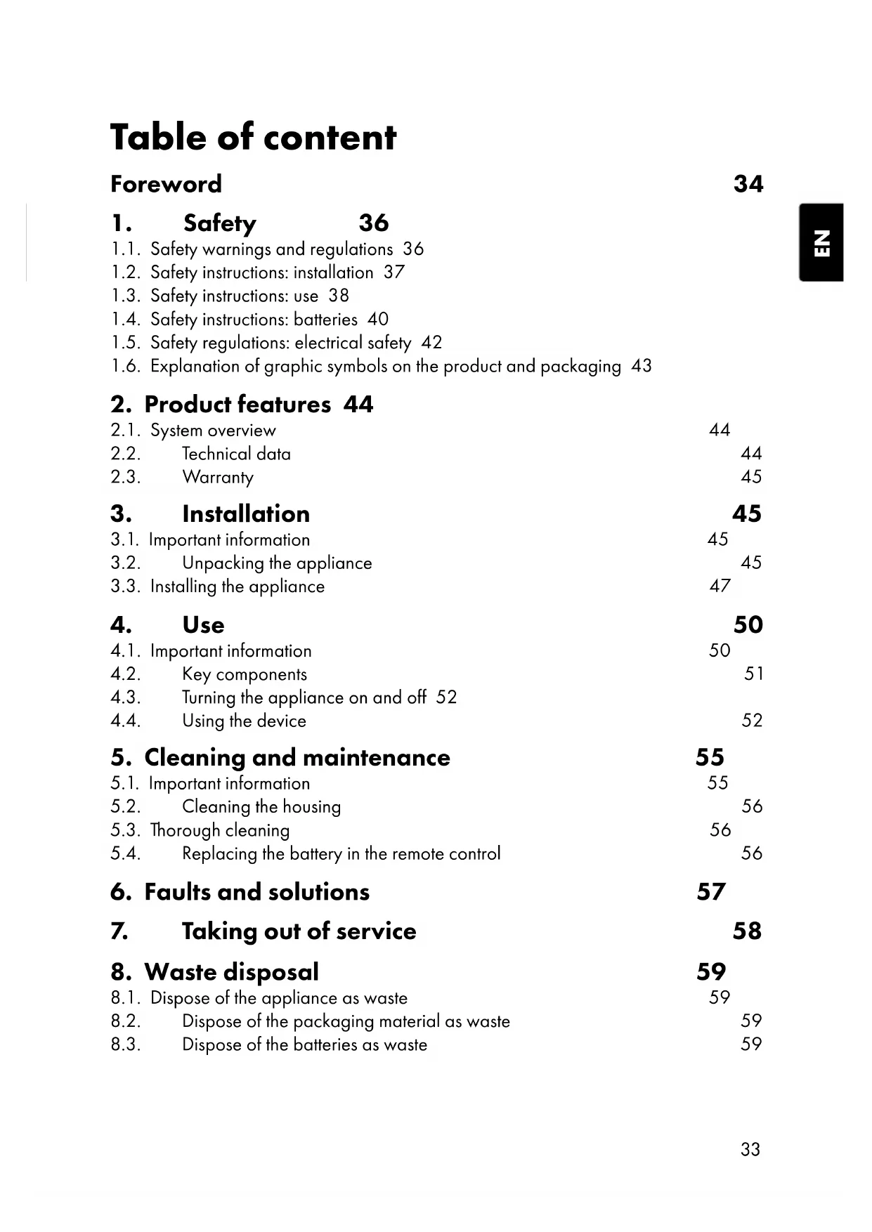 8.1. Dispose of the appliance as waste 59 8.2. Dispose of the packaging material as waste 59 8.3. Dispose of the batteries as waste 59 Table of content34