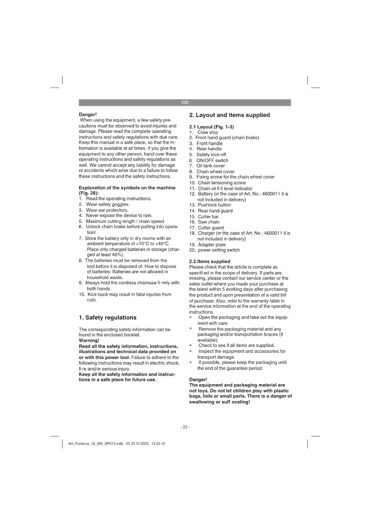If possible, please keep the packaging until the end of the guarantee period. Danger! The equipment and packaging material are not toys. Do not let children play with plastic bags, foils or small parts. There is a danger of swallowing or suff ocating! Anl_Fortexxa_18_300_SPK13.indb 22 23.10.2023 13:52:10GB