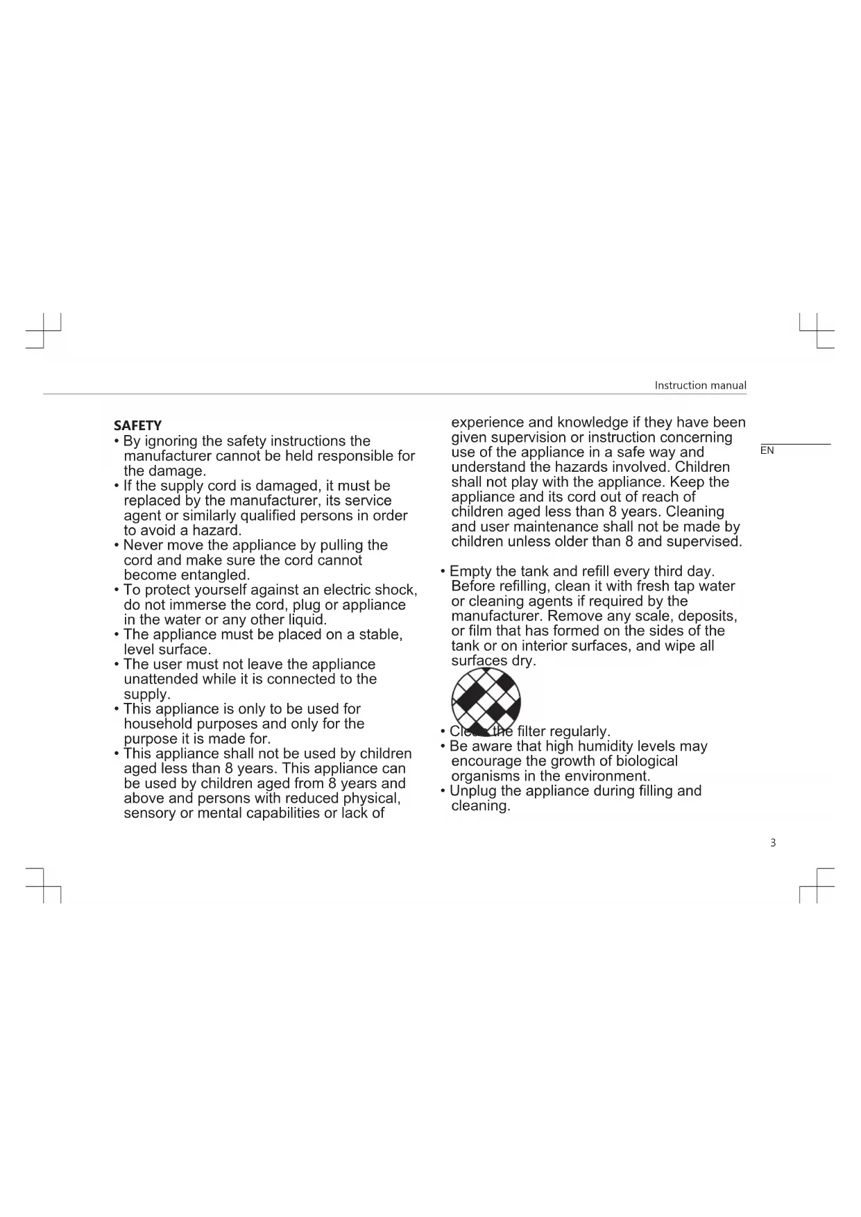 - Unplug the appliance during filling and cleaning. ENInstruction manual