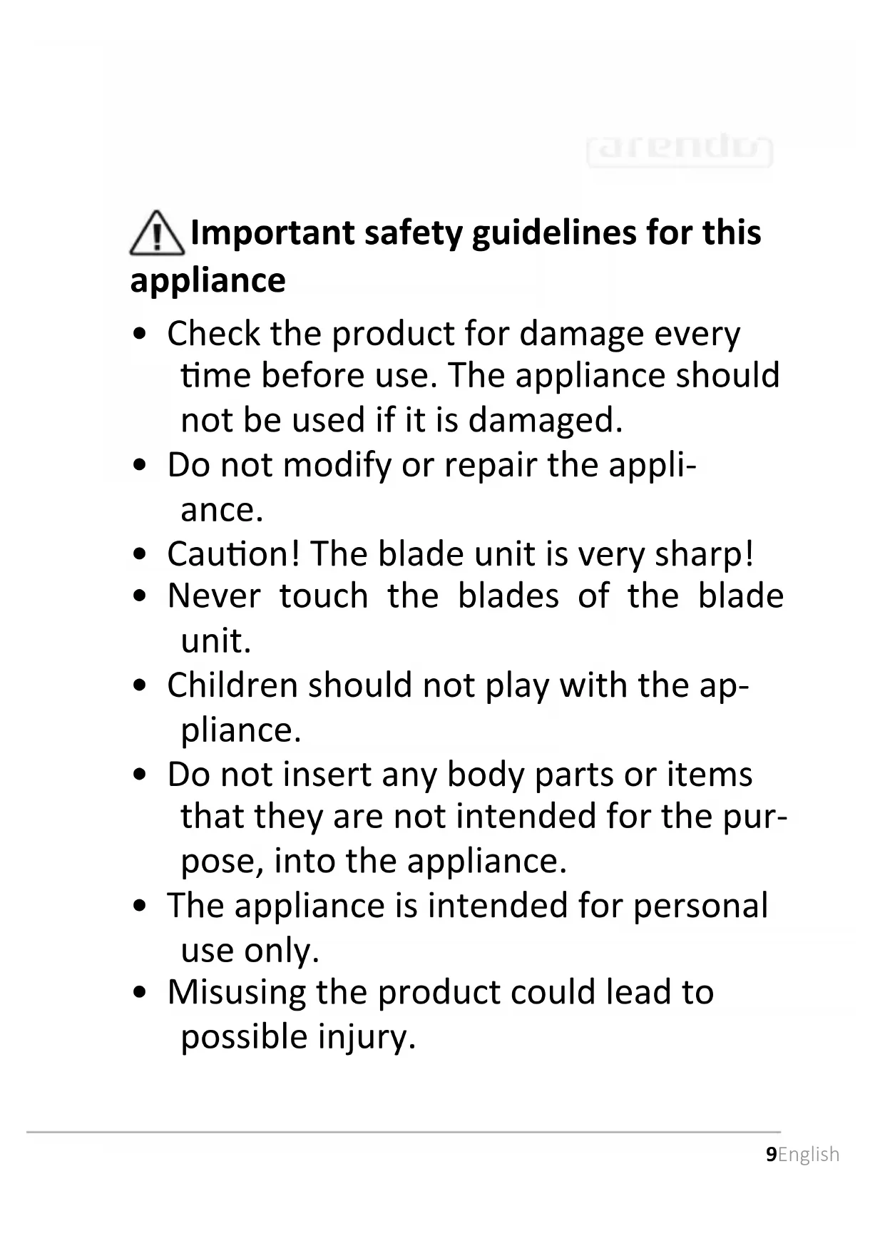 - Do not insert any body parts or items that they are not intended for the pur- pose, into the appliance.