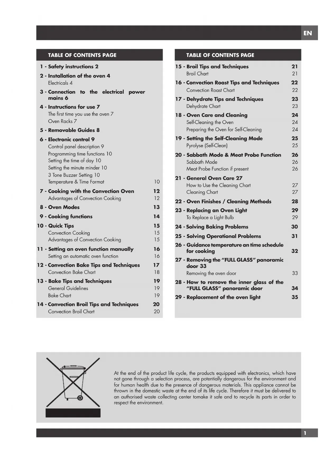 The light is on only. --- In this mode only the internal oven convection fan is ON i.e. there is no oven heating This mode is used to defrost deepfrozen food. In this mode both upper (top) and lower (bottom) oven heating elements are used to heat the oven air. However, no fan is used to circulate the heat. This is the traditional mode of cooking on one shelf. Therefore only one rack can be used when selecting the Bake mode. Ideal for Appetizers, Biscuits, Coffee Cakes and Cookies. This mode is intended to save energy. In particular the oven cooling fan works only when needed e.g. when the oven is hot and the electronics require cooling. Ideal for frozen or precooked food, and small portions-mealsThe preheat time is very short and cooking tends to be slower.It is not recommended for heavy loads e.g. large portions or big meal preparation. The Convection Bake mode uses the circular or third heating element hidden behind the baffle at the back wall of the oven. The heat is circulated throughout the oven by the convection fan. Consequently different foods can be cooked simultaneously (maximum three levels) and is suitable for preparing a complete dinner (small portions). Mixing of flavours is avoided and an important energy saving is obtained. The Convection Down mode uses the lower (Bottom) heating element and internal fan. Useful for soufflés, pizzas and pastry dishes. suitable for preparing a complete dinner (small portions). Mixing of flavours is avoided and an important energy saving is obtained. Ideal for steak, hamburgers, chicken quarters or chicken breasts. The Grill mode uses intense heat radiated from the upper (top) heating element. Ideal for preparing toast, browning and grilling. The standard time is 1.30 h and can be changed. (see page 25) PYRO or self-cleaning mode. Here the oven is automatically cleaned by burning-off cooking residuesathightemperature(about475°C)from 1h to 3h. During the self-cleaning cycle all fumes produced are filtered and then expelled to ambient.EN