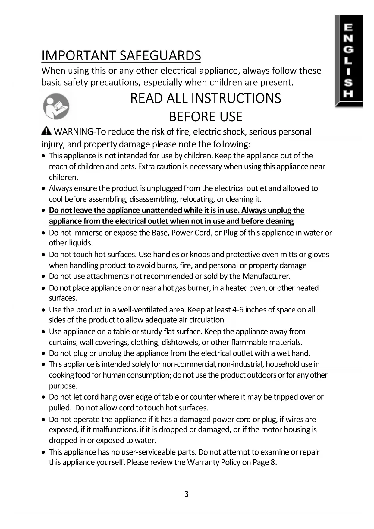 BEFORE USE WARNING-To reduce the risk of fire, electric shock, serious personal injury, and property damage please note the following: