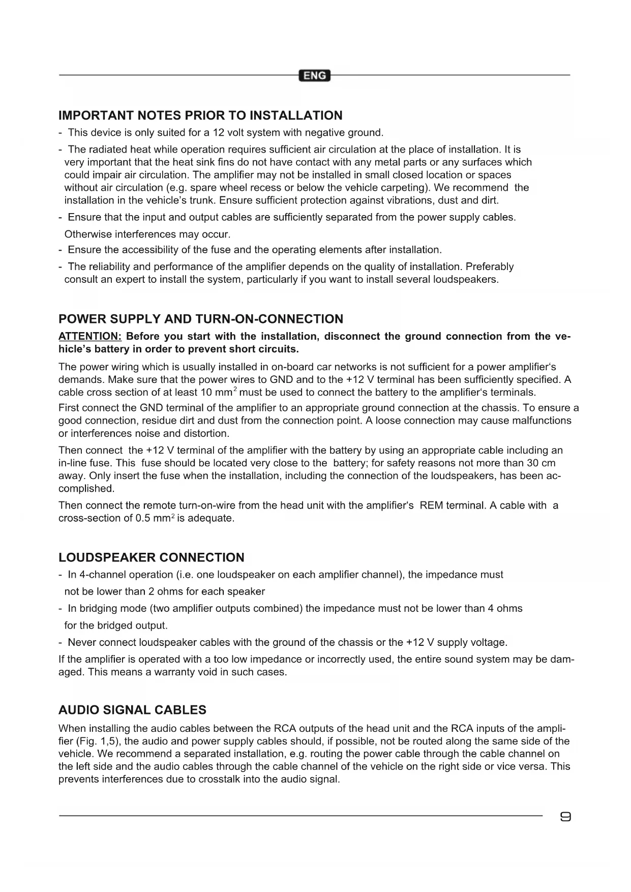 - This device is only suited for a 12 volt system with negative ground. - The radiated heat while operation requires sufcient air circulation at the place of installation. It is very important that the heat sink ns do not have contact with any metal parts or any surfaces which could impair air circulation. The amplier may not be installed in small closed location or spaces without air circulation (e.g. spare wheel recess or below the vehicle carpeting). We recommend the installation in the vehicle’s trunk. Ensure sufcient protection against vibrations, dust and dirt. - Ensure that the input and output cables are sufciently separated from the power supply cables. Otherwise interferences may occur. - Ensure the accessibility of the fuse and the operating elements after installation. - The reliability and performance of the amplier depends on the quality of installation. Preferably consult an expert to install the system, particularly if you want to install several loudspeakers.