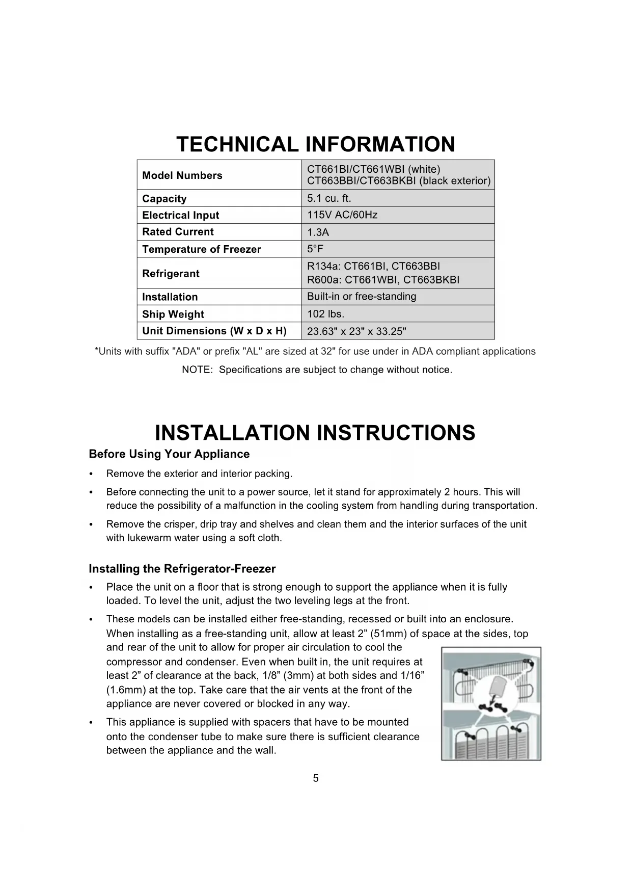 Electrical Input 115V AC/60Hz Rated Current 1.3A Temperature of Freezer 5°F Refrigerant R134a: CT661BI, CT663BBI R600a: CT661WBI, CT663BKBI Installation Built-in or free-standing Ship Weight 102 lbs. Unit Dimensions (W x D x H) 23.63" x 23" x 33.25" *Units with suffix "ADA" or prefix "AL" are sized at 32" for use under in ADA compliant applications NOTE: Specifications are subject to change without notice.