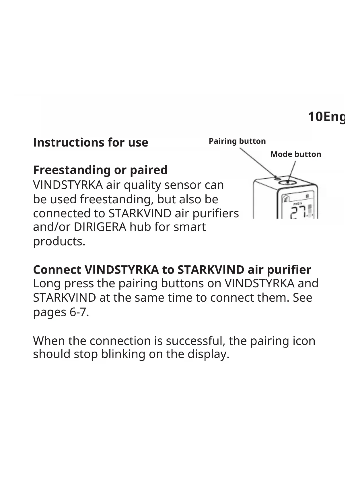 Connect VINDSTYRKA to DIRIGERA hub By connecting VINDSTYRKA to DIRIGERA hub, you'll be able to see the room’s air quality in the IKEA Home smart app. If you have an iOS device: Go to the App Store and download the IKEA Home smart app. The app will show you how to connect VINDSTYRKA to DIRIGERA hub. If you have an Android device: Go to Google Play and download the IKEA Home smart app. The app will show you how to connect VINDSTYRKA to DIRIGERA hub.12 Pairing: Connecting VINDSTYRKA air quality sensor to DIRIGERA hub and STARKVIND air purier.