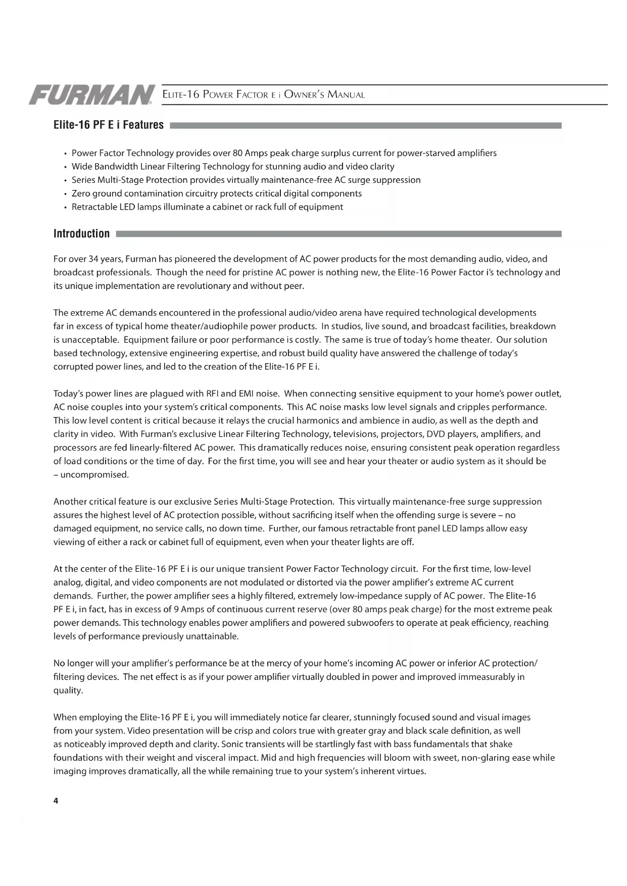 Elite-16 PF E i Features Power Factor Technology provides over 80 Amps peak charge surplus current for power-starved ampliers Wide Bandwidth Linear Filtering Technology for stunning audio and video clarity Series Multi-Stage Protection provides virtually maintenance-free AC surge suppression Zero ground contamination circuitry protects critical digital components Retractable LED lamps illuminate a cabinet or rack full of equipment Introduction For over 34 years, Furman has pioneered the development of AC power products for the most demanding audio, video, and broadcast professionals. Though the need for pristine AC power is nothing new, the Elite-16 Power Factor i’s technology and its unique implementation are revolutionary and without peer. The extreme AC demands encountered in the professional audio/video arena have required technological developments far in excess of typical home theater/audiophile power products. In studios, live sound, and broadcast facilities, breakdown is unacceptable. Equipment failure or poor performance is costly. The same is true of today’s home theater. Our solution based technology, extensive engineering expertise, and robust build quality have answered the challenge of today’s corrupted power lines, and led to the creation of the Elite-16 PF E i. Today’s power lines are plagued with RFI and EMI noise. When connecting sensitive equipment to your home’s power outlet, AC noise couples into your system’s critical components. This AC noise masks low level signals and cripples performance. This low level content is critical because it relays the crucial harmonics and ambience in audio, as well as the depth and clarity in video. With Furman’s exclusive Linear Filtering Technology, televisions, projectors, DVD players, ampliers, and processors are fed linearly-ltered AC power. This dramatically reduces noise, ensuring consistent peak operation regardless of load conditions or the time of day. For the rst time, you will see and hear your theater or audio system as it should be – uncompromised. Another critical feature is our exclusive Series Multi-Stage Protection. This virtually maintenance-free surge suppression assures the highest level of AC protection possible, without sacricing itself when the oending surge is severe – no damaged equipment, no service calls, no down time. Further, our famous retractable front panel LED lamps allow easy viewing of either a rack or cabinet full of equipment, even when your theater lights are o. At the center of the Elite-16 PF E i is our unique transient Power Factor Technology circuit. For the rst time, low-level analog, digital, and video components are not modulated or distorted via the power amplier’s extreme AC current demands. Further, the power amplier sees a highly ltered, extremely low-impedance supply of AC power. The Elite-16 PF E i, in fact, has in excess of 9 Amps of continuous current reserve (over 80 amps peak charge) for the most extreme peak power demands. This technology enables power ampliers and powered subwoofers to operate at peak eciency, reaching levels of performance previously unattainable. No longer will your amplier’s performance be at the mercy of your home’s incoming AC power or inferior AC protection/ ltering devices. The net eect is as if your power amplier virtually doubled in power and improved immeasurably in quality. When employing the Elite-16 PF E i, you will immediately notice far clearer, stunningly focused sound and visual images from your system. Video presentation will be crisp and colors true with greater gray and black scale denition, as well as noticeably improved depth and clarity. Sonic transients will be startlingly fast with bass fundamentals that shake foundations with their weight and visceral impact. Mid and high frequencies will bloom with sweet, non-glaring ease while imaging improves dramatically, all the while remaining true to your system’s inherent virtues.