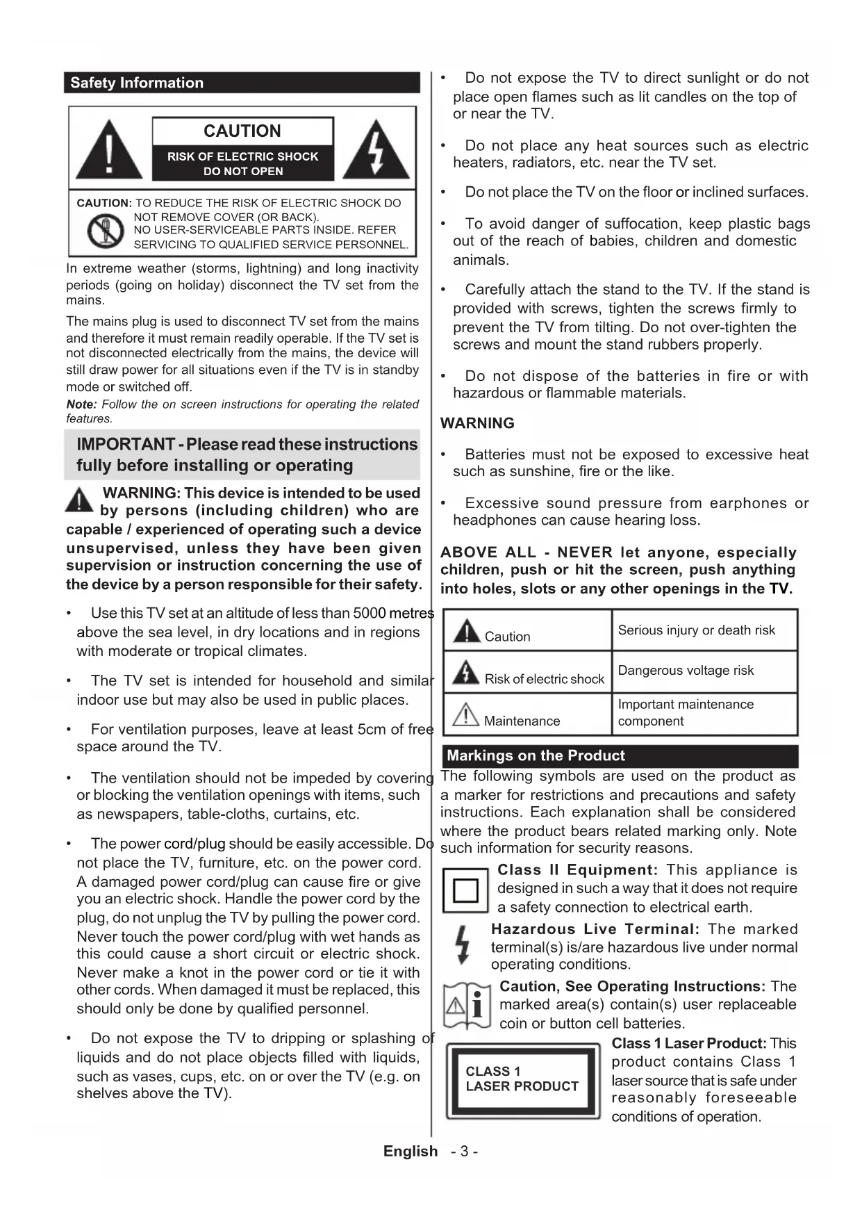 - Excessive sound pressure from earphones or headphones can cause hearing loss. ABOVE ALL - NEVER let anyone, especially children, push or hit the screen, push anything into holes, slots or any other openings in the TV. Caution Serious injury or death risk Risk of electric shock Dangerous voltage risk Maintenance Important maintenance component Markings on the Product The following symbols are used on the product as a marker for restrictions and precautions and safety instructions. Each explanation shall be considered where the product bears related marking only. Note such information for security reasons. Class II Equipment: This appliance is designed in such a way that it does not require a safety connection to electrical earth. Hazardous Live Terminal: The marked terminal(s) is/are hazardous live under normal operating conditions.