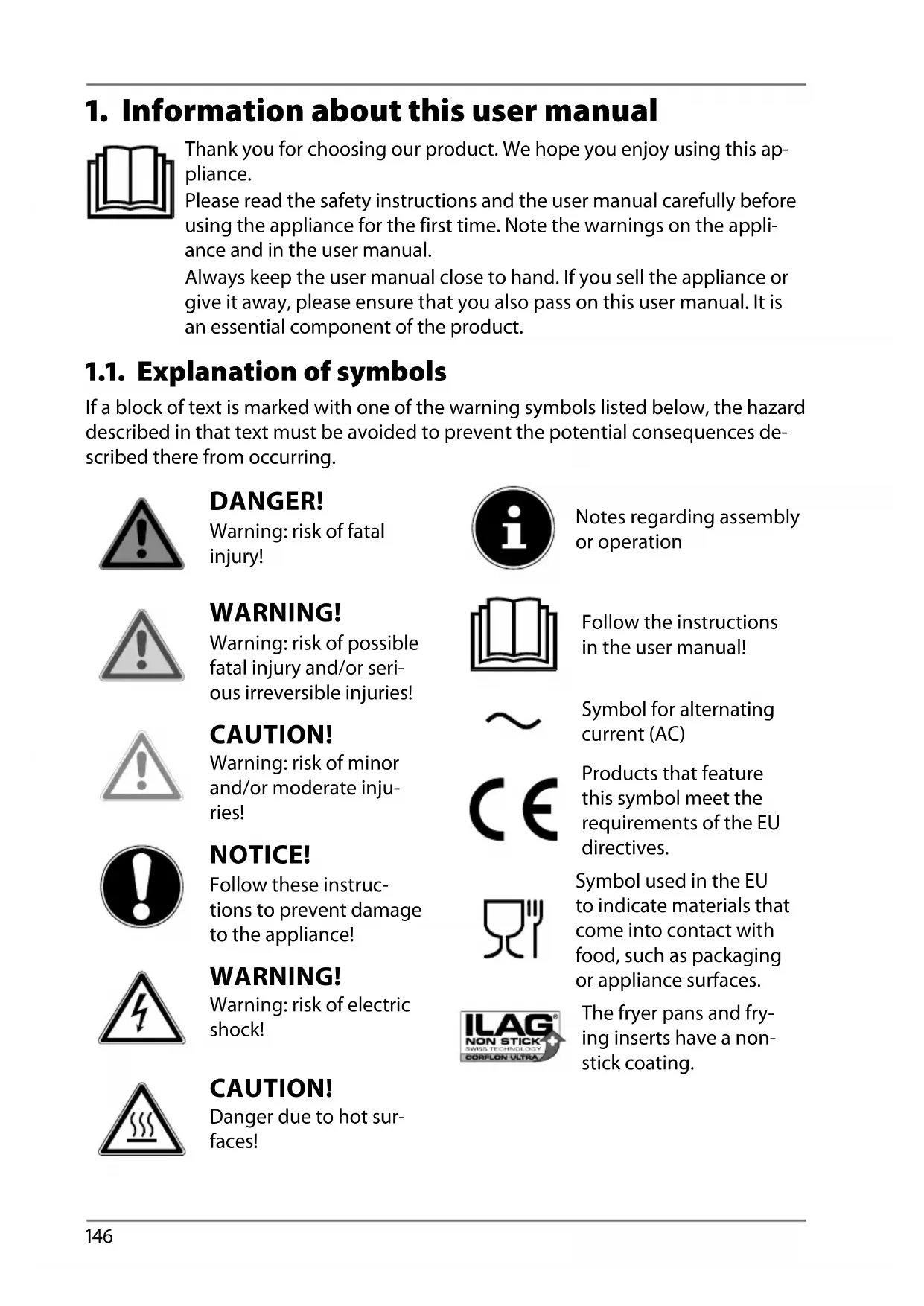 . Information about this user manual Thank you for choosing our product. We hope you enjoy using this ap- pliance. Please read the safety instructions and the user manual carefully before using the appliance for the first time. Note the warnings on the appli- ance and in the user manual. Always keep the user manual close to hand. If you sell the appliance or give it away, please ensure that you also pass on this user manual. It is an essential component of the product. .. Explanation of symbols If a block of text is marked with one of the warning symbols listed below, the hazard described in that text must be avoided to prevent the potential consequences de- scribed there from occurring. DANGER!
