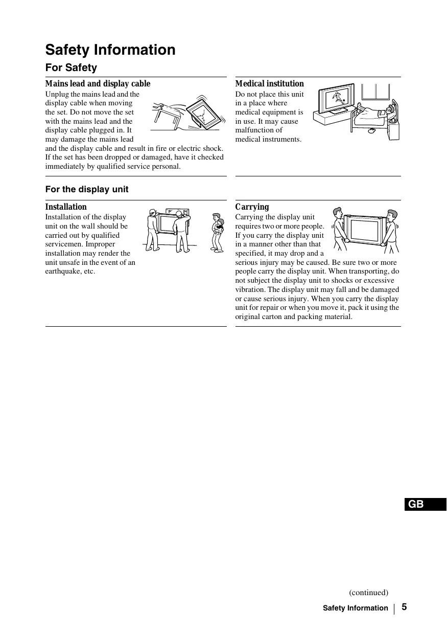 Table of Contents Safety Information For Safety Mains lead and display cable Medical institution Unplug the mains lead and the display cable when moving the set. Do not move the set with the mains lead and the display cable plugged in. It may damage the mains lead and the display cable and result in fire or electric shock. If the set has been dropped or damaged, have it checked immediately by qualified service personal. Do not place this unit in a place where medical equipment is in use. It may cause malfunction of medical instruments. For the display unit Installation Carrying Installation of the display unit on the wall should be carried out by qualified servicemen. Improper installation may render the unit unsafe in the event of an earthquake, etc. Carrying the display unit requires two or more people. If you carry the display unit in a manner other than that specified, it may drop and a serious injury may be caused. Be sure two or more people carry the display unit. When transporting, do not subject the display unit to shocks or excessive vibration. The display unit may fall and be damaged or cause serious injury. When you carry the display unit for repair or when you move it, pack it using the original carton and packing material.