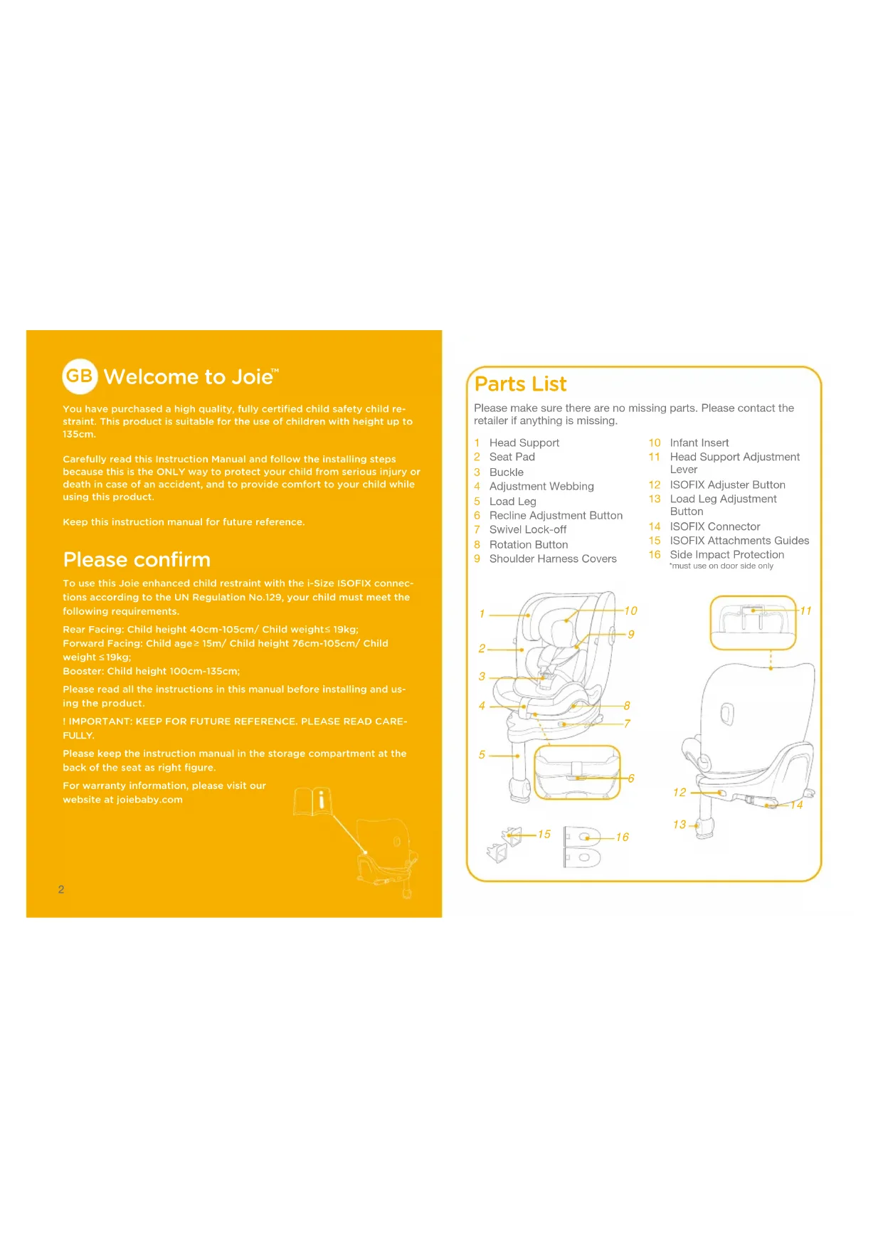 You have purchased a high quality﹐ fully certified child safety child re-straint. This product is suitable for the use of children with height up to 135cm.Carefully read this Instruction Manual and follow the installing steps because this is the ONLY way to protect your child from serious injury or death in case of an accident﹐ and to provide comfort to your child while using this product.Keep this instruction manual for future reference. Please confirm To use this Joie enhanced child restraint with the i-Size ISOFIX connec-tions according to the UN Regulation No.129﹐ your child must meet the following requirements.Rear Facing: Child height 40cm-105cm/ Child weight 19kg; Forward Facing: Child age 15m/ Child height 76cm-105cm/ Child weight 19kg; Booster: Child height 100cm-135cm;Please read all the instructions in this manual before installing and us-ing the product.! IMPORTANT: KEEP FOR FUTURE REFERENCE. PLEASE READ CARE-FULLY.Please keep the instruction manual in the storage compartment at the back of the seat as right figure. For warranty information﹐ please visit our website at joiebaby.com Parts List 1 Head Support2 Seat Pad3 Buckle4 Adjustment Webbing5 Load Leg6 Recline Adjustment Button7 Swivel Lock-off8 Rotation Button9 Shoulder Harness Covers10 Infant Insert11 Head Support Adjustment Lever12 ISOFIX Adjuster Button13 Load Leg Adjustment Button14 ISOFIX Connector15 ISOFIX Attachments Guides16 Side Impact Protection *must use on door side onlyPlease make sure there are no missing parts. Please contact the retailer if anything is missing.