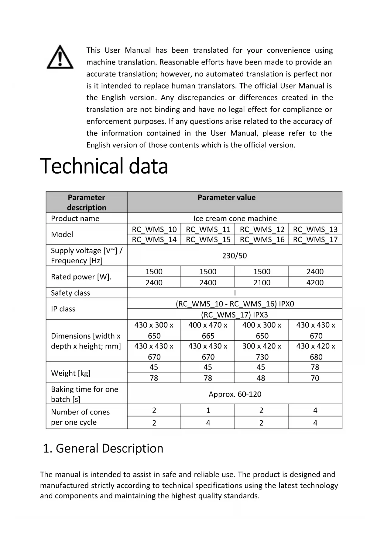 CAUTION! Read all safety warnings and instructions. Failure to follow the warnings and instructions may result in electric shock, fire, and/or serious injury or death. The term "device" or "product" in the warnings and the description of the instructions refers to: Ice cream cone machine. 2.1. Electrical safety a) The plug of this device must fit into the outlet. Do not modify the plug in any way. Original plugs and matching outlets reduce the risk of electric shock. b) Av oid touching grounded parts, such as pipes, heaters, ovens, and refrigerators. There is an increased risk of electric shock if your body is grounded and touches the device while exposed to direct rain, wet pavement, or while working in a damp environment. If water enters the device, there is an increased risk of damage to the unit and electric shock. c) Do not touch the device with wet or damp hands. d) Do not use the cord in an unintended manner. Never use it to carry the device or to pull the plug out of the socket. Keep the cord away from heat sources, oil, sharp edges, or moving parts. Damaged or tangled cords increase the risk of electric shock. e) I f you cannot avoid using the product in a wet environment, use a residual current device (RCD) to connect it to electrical mains. Using an RCD reduces the risk of electric shock. f) D o not use the device if the power cord is damaged or shows signs of wear. A damaged power cord should be replaced by a qualified electrician or the manufacturer's service department. CAUTION! The figures in this manual are illustrative only and may vary in some details from the actual appearance of the product.g) To avoid electric shock, do not immerse the cable, plug, or the device itself in water or other liquid. Do not use the appliance on wet surfaces. h) CAUTION – DANGER TO LIFE! When cleaning or using the appliance, never immerse it in water or other liquids.