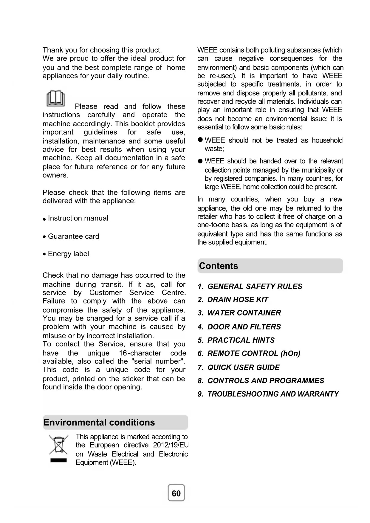 Please read and follow these instructions carefully and operate the machine accordingly. This booklet provides important guidelines for safe use, installation, maintenance and some useful advice for best results when using your machine. Keep all documentation in a safe place for future reference or for any future owners.