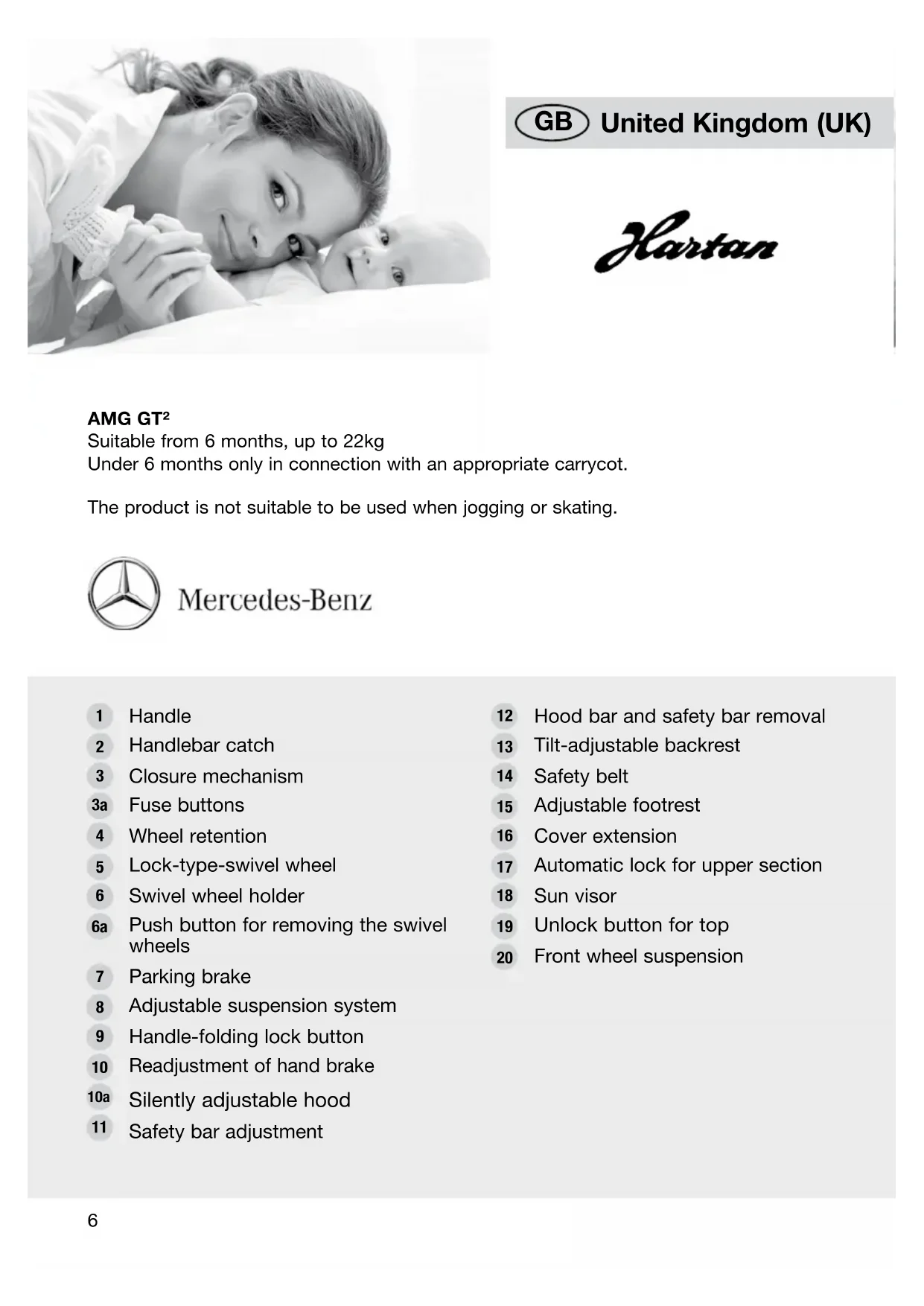 AMG GT² Suitable from 6 months, up to 22kg Under 6 months only in connection with an appropriate carrycot. The product is not suitable to be used when jogging or skating. Handle Handlebar catch Closure mechanism Fuse buttons Wheel retention Lock-type-swivel wheel Swivel wheel holder Push button for removing the swivel wheels Parking brake Adjustable suspension system Handle-folding lock button Readjustment of hand brake Silently adjustable hood Safety bar adjustment Hood bar and safety bar removal Tilt-adjustable backrest Safety belt Adjustable footrest Cover extension Automatic lock for upper section Sun visor Unlock button for top Front wheel suspension