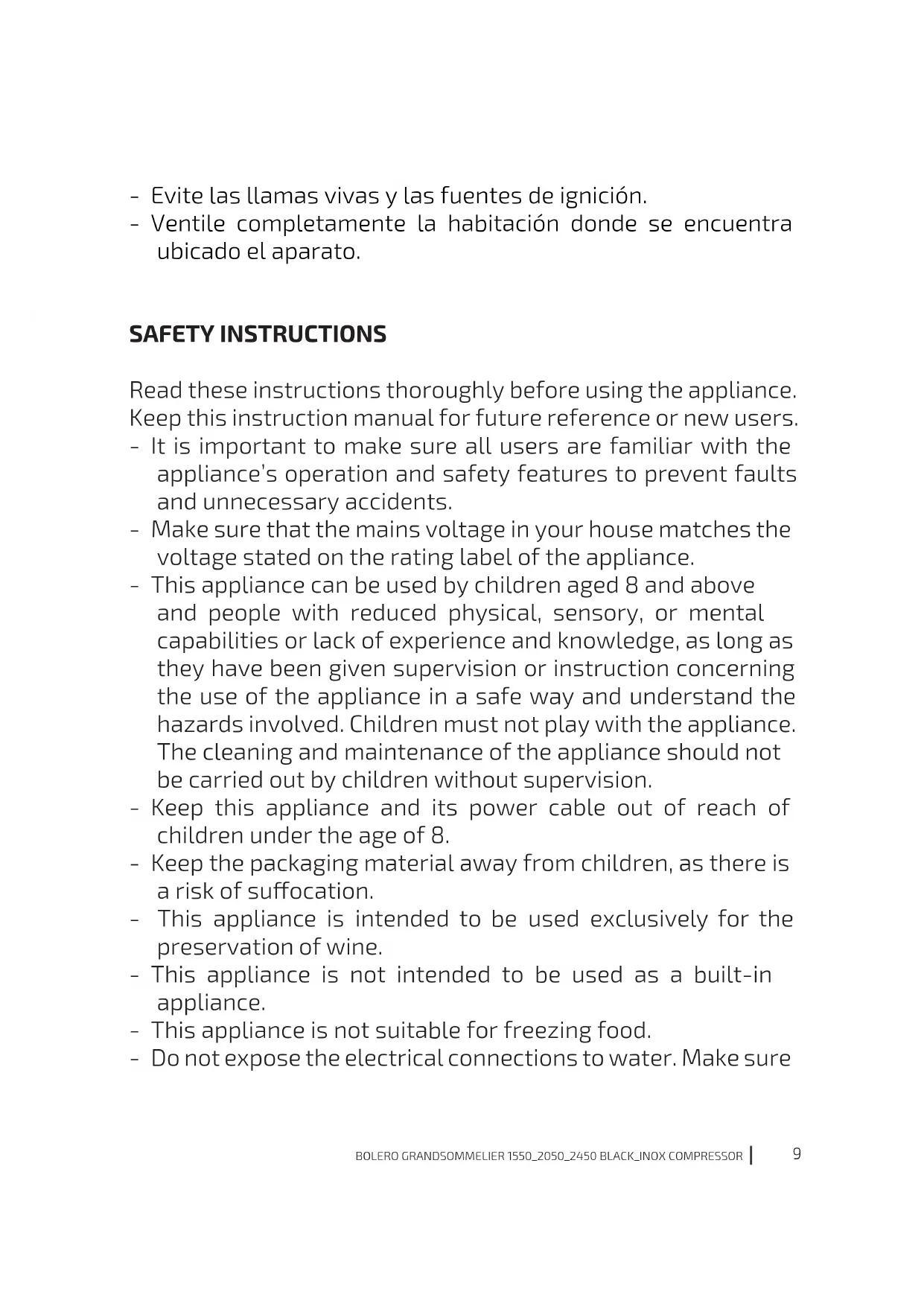 - Evite las llamas vivas y las fuentes de ignición. - Ventile completamente la habitación donde se encuentra ubicado el aparato. SAFETY INSTRUCTIONS Read these instructions thoroughly before using the appliance. Keep this instruction manual for future reference or new users. - It is important to make sure all users are familiar with the appliance’s operation and safety features to prevent faults and unnecessary accidents. - Make sure that the mains voltage in your house matches the voltage stated on the rating label of the appliance. - This appliance can be used by children aged 8 and above and people with reduced physical, sensory, or mental capabilities or lack of experience and knowledge, as long as they have been given supervision or instruction concerning the use of the appliance in a safe way and understand the hazards involved. Children must not play with the appliance. The cleaning and maintenance of the appliance should not be carried out by children without supervision. - Keep this appliance and its power cable out of reach of children under the age of 8. - Keep the packaging material away from children, as there is a risk of suocation. - This appliance is intended to be used exclusively for the preservation of wine. - This appliance is not intended to be used as a built-in appliance. - This appliance is not suitable for freezing food. - Do not expose the electrical connections to water. Make sure10